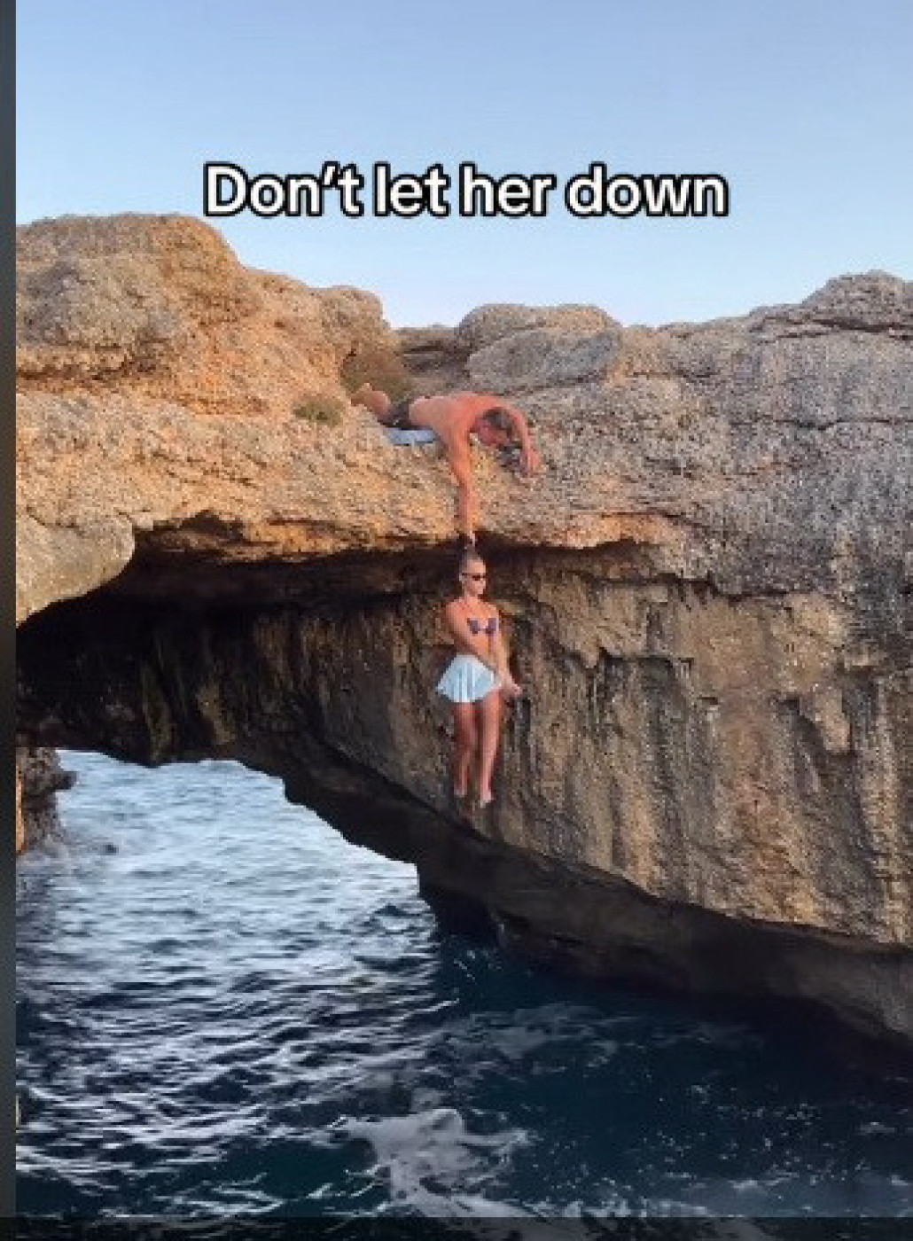 Da li znate onu scenu iz filmova kada neko visi sa neke litice dok ga neko drugi rukama pridržava? Takvi kadrovi lede krv u žilama iako znamo da se snimaju u studiju, svaki put su toliko uverljive da mnogi zatvaraju oči pred njima. Ovo nije scena iz filma već iz realnog života a prikazuje momka koji pridržava sa litice grebena devojku za rep a ona visi iznad vode.