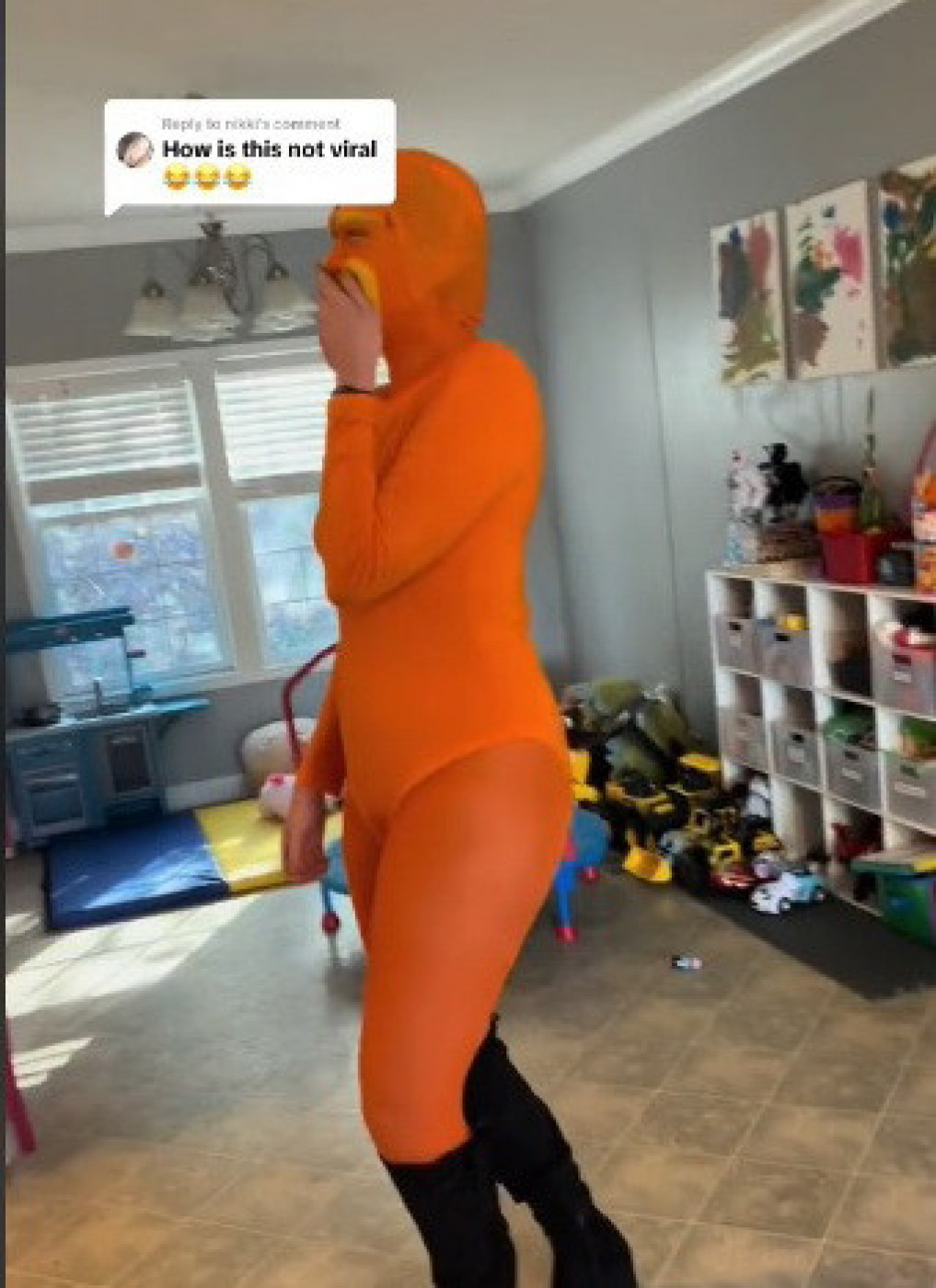 Obučena u narandžasti pripijen kostim uz telo sa brkovima i čizmama na nogama, ona je sela na krevet kad je u sobu ušla devojčica. Ugledavši nepoznatog i čudnog čiku koji je sedeo na krevetu dete je vrisnulo od straha dok se njen krik prolomio kroz kuću. Majka je odmah uletela u sobu i dograbila devojčicu koja je od straha plakala i vrištala.