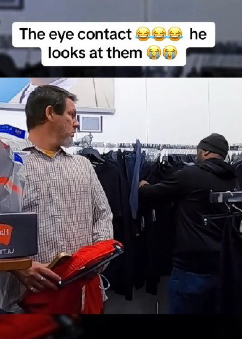 U urnebesnom snimku koji kruži društvenim mrežama i koji je prikupio 1,1 milion sviđanja vidi se kako ga neke žene gledaju razočarano i zgroženo dok je drugima ovo zabavno i smešno. Bilo je i onih, naročito među muškarcima koji su pokušali da ostanu "iskulirani" iako se videlo na njihovom licu da su na ivici da prasnu u smeh. Čovek se nije obazirao na njihove reakcije već je pokušavao da izgleda još nezainteresovanije i kao da ga ništa ne dotiče što je situaciju učinilo još komičnijom. Reakcija jedne žene je bila posebno urnebesna jer se toliko smejala da se prebacila preko kolica za trgovinu od smeha, dok su dve devojke posmatrale prizor šokirano gledajući i ne mogavši da veruju šta se zapravo zbiva, što je na snimku okarakterisano sa opisom "sviđa im se".