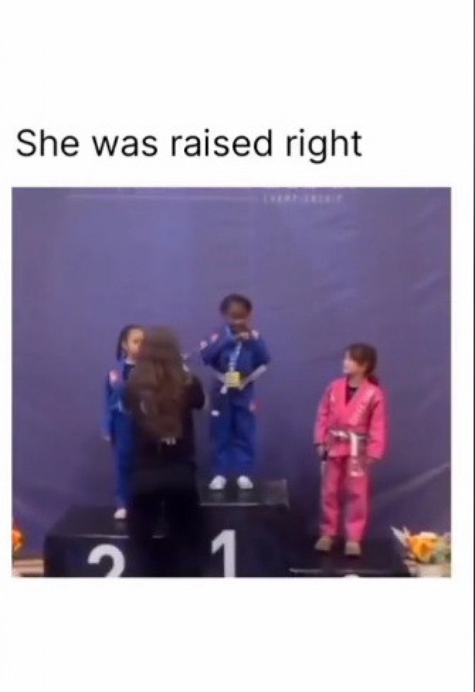 Jedna mala Afroamerikanka je na TikToku sakupila sve simpatije korisnika mreže koji su bili oduševljeni njenim dečijim iskrenim potezom nakon pobede u jednom sportskom takmičenju. Ona je sa takmičarkama koje su osvojile drugo i treće mesto čekala da joj dodele medalju a kada je to učinjeno ona je ispozirala novinarima podigavši ruke pokazavši mišiće.