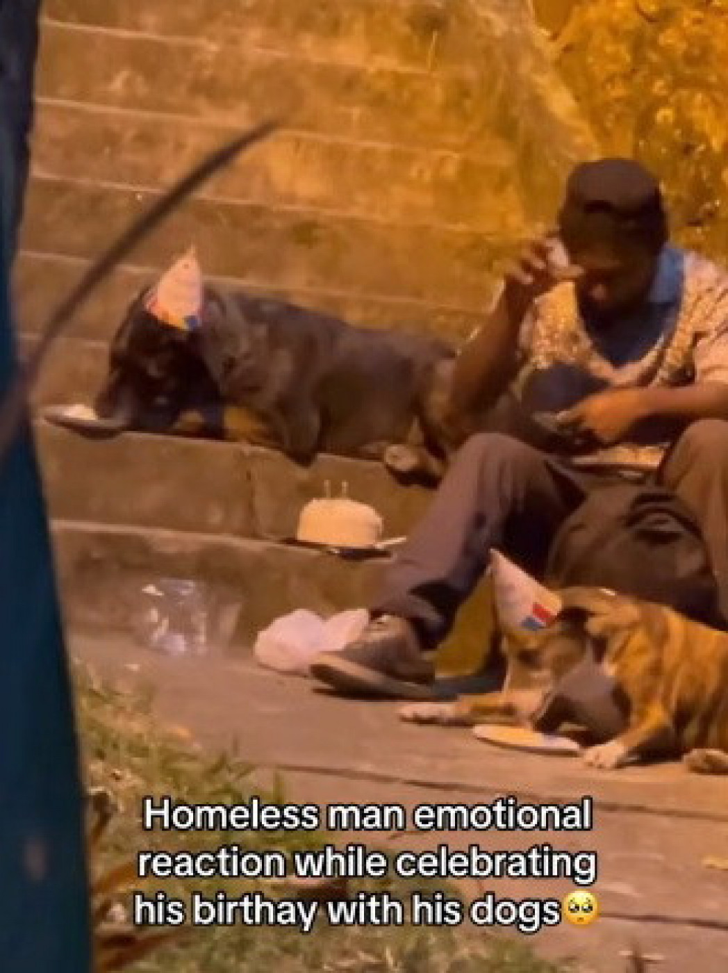 Emotivna slika čoveka nije nikoga ostavila ravnodušnim a u snimku se vidi kako grli pse kojima je na glavu stavio rođendanske kapice i koji su mu, kako se čini i najveća podrška i društvo koje mu je u tom trenutku bilo i više nego potrebno. Dok su prolaznici prolazili pored njega i pasa, on je sam sebi aplaudirao i pevao rođendansku pesmu gledajući svoje ljubimce a onda je na kraju i dunuo i ugasio svećice na torti.
