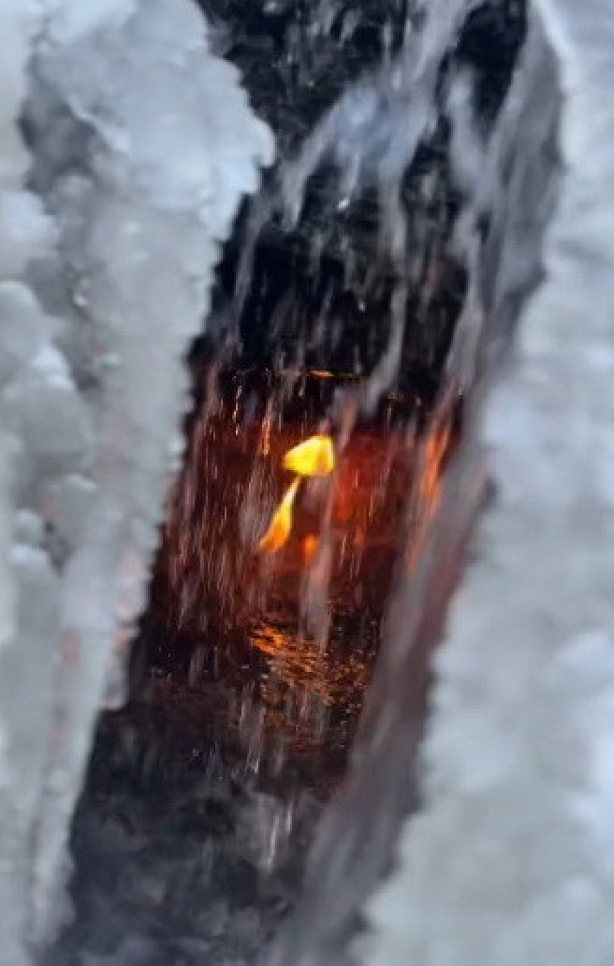 Jedan Tiktoker objavio je interesantan snimak ispred malog zaleđenog vodopada unutar jedne rupe iz koje se nazirao plamen. Voda je tekla a unutar rupe gde se nalazio vodopad vidi se vatra u daljini koja neprestano sagoreva.