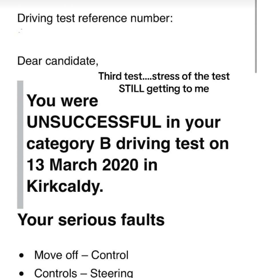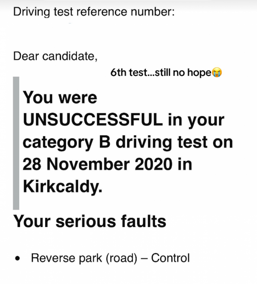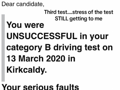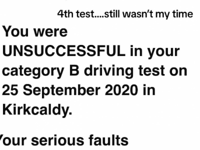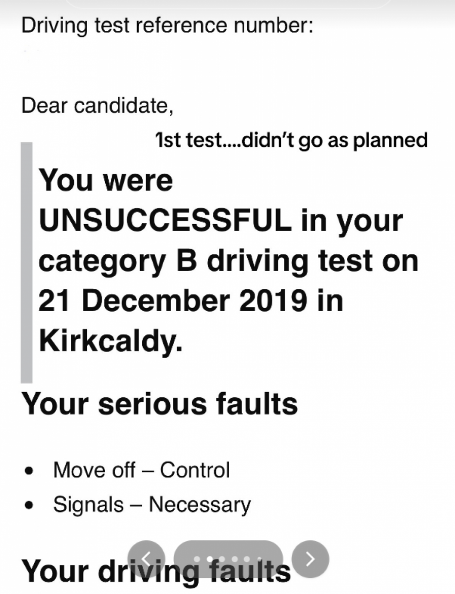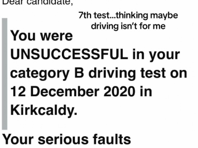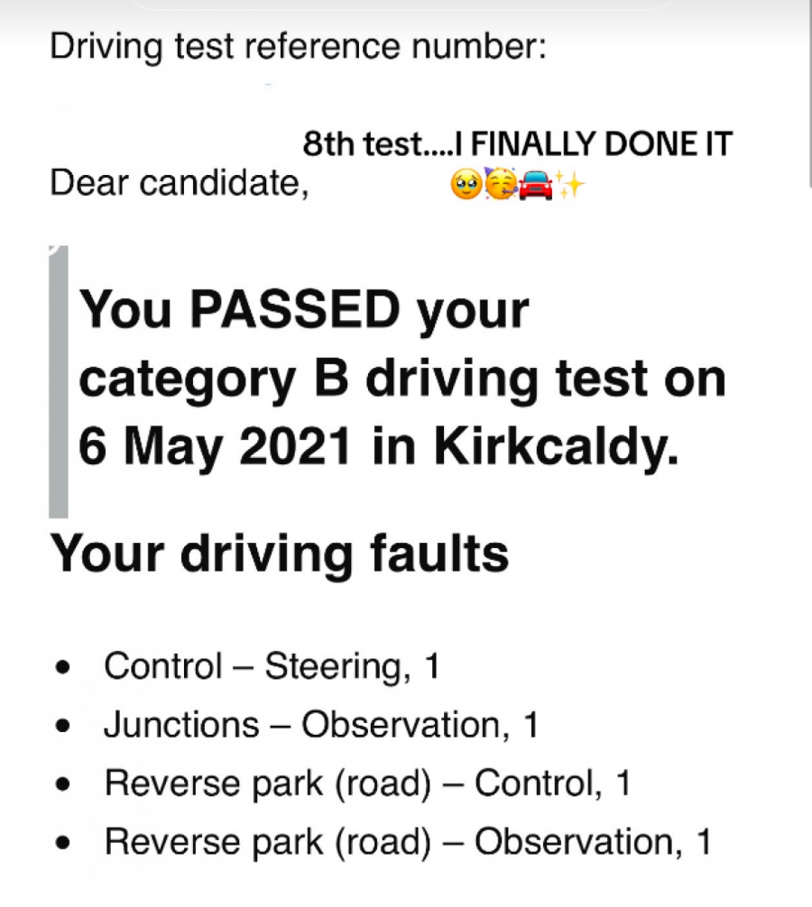 Ova uporna devojka je tokom borbe da položi vozački ispit, imala mnogo teških trenutaka. Jednom je čak doživela napad panike i zaplakala i to tokom drugog pokušaja. S druge strane je čak prošla kroz crveno svetlo tokom petog pokušaja polaganja vozačkog. Nakon sedmog neuspeha, počela je da razmišlja da možda vožnja nije za nju i razmatrala je mogućnost da odustane zauvek.