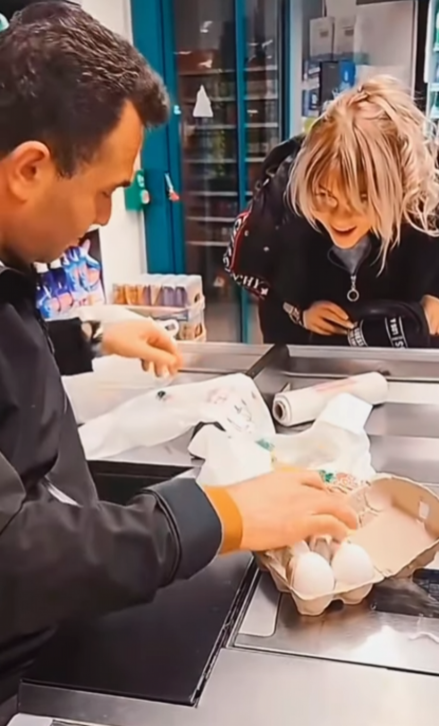 Prodavac je vidno negodujući izmerio ženi mandarine bez kora, ali na tome se nije zaustavio. Žena je u korpi imala i pakovanje jaja. Budući da je svaku mandarinu oljuštila, kasir je rešio da pođe njenim rpimerom, pa je uzeo salvetu i počeo za kasom da razbija jaja, jedno za drugim. Žena je u trenutku pomislila da je u pitanju neka šala, pa se nasmejala kad je kasir razbio prvo jaje, ali kad je razbio i drugo jaje iz karotnskog pakovanja već joj nije bilo do smeha.