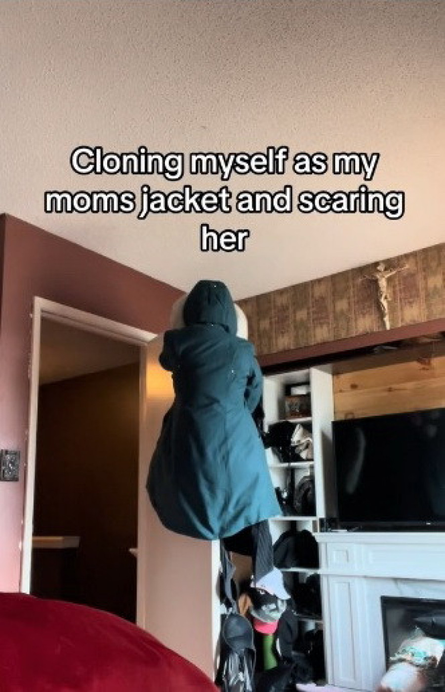 Želeći da napravi skrivenu kameru svojoj majci i malo se našali sa njom, jedna devojka odlučila se na nesvakidašnji potez. Obukla je majčinu jaknu i uspela nekako da se popne na vrata od sobe, viseći tako na ivici bez pomeranja. Iako se činilo isprva da je na vratima zakačena jakna, devojka je želela da postigne drugi cilj.
