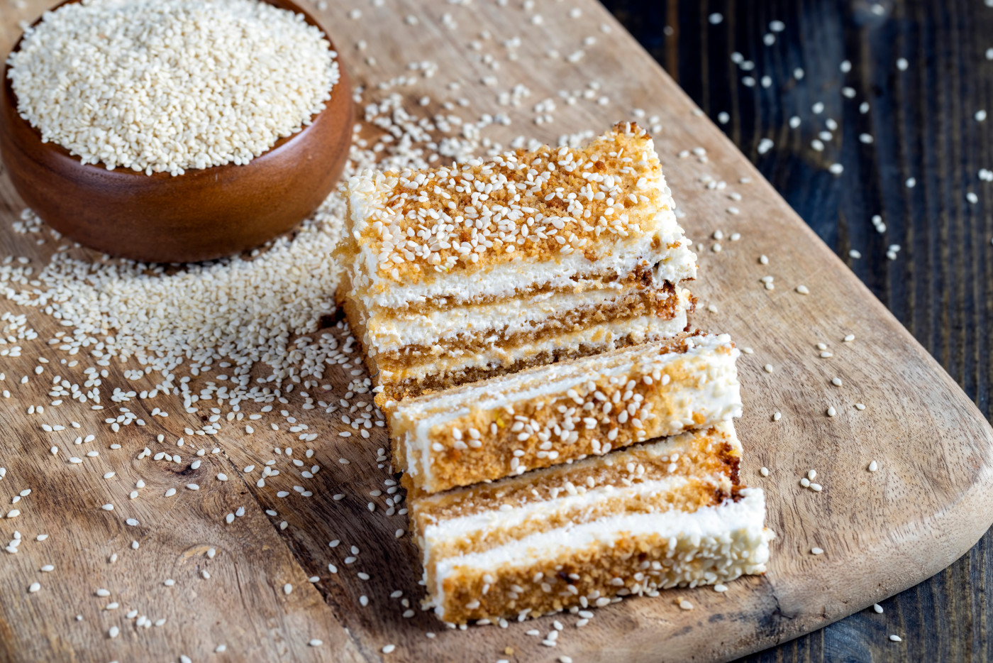 Pripremite kalup ili dublju posudu za slaganje torte. Na samo dno ravnomerno pospite polovinu prethodno prženog susama - on će kasnije dati lep izgled i dodatni ukus kada tortu okrenete.