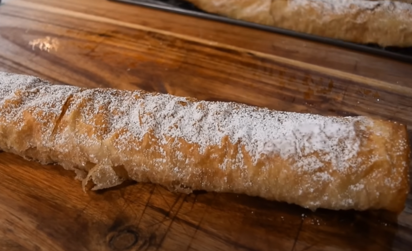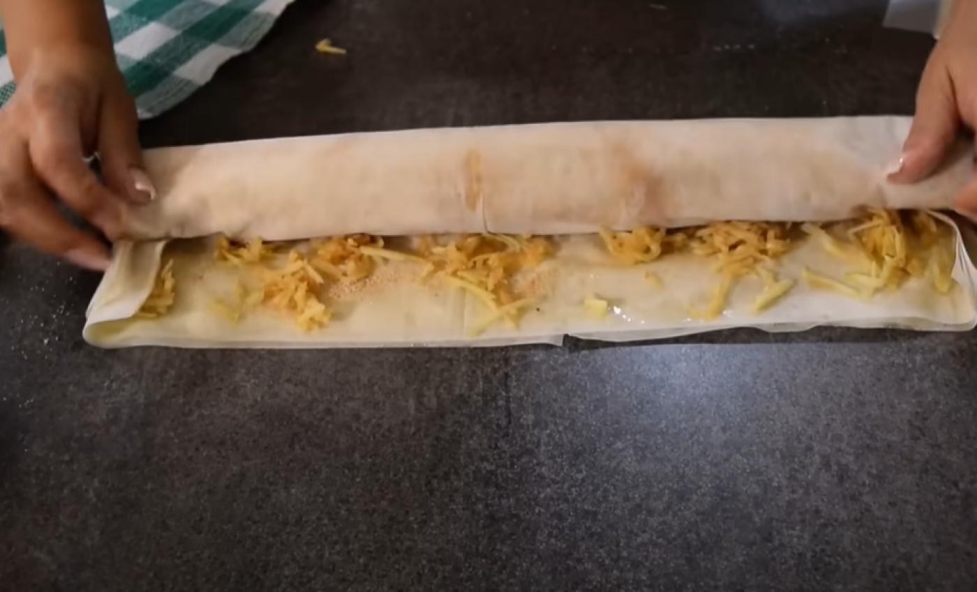Griz sipajte u činiju i dodajte pola kašike cimeta. Potom, sipajte pet do šest kašika šećera, a onda i jednu kesicu vanilinog šećera. Sipajte dve kašike prezli i sve to sjedinite kašikom. Ako želite da budu slađe dodajte još, ali ovo je dovoljno. Kisele jabuke oljuštite od kore i izrendajte. Stavite prvo koru, pa premažite uljem. Stavite po kašiku ili dve smese koju ste napravili. Zatim, stavite drugu koru i ponovo malo ulja, a onda pospite smesom. Sa trećom korom uradite isto, a tek na četvrtu stavljate smesu.