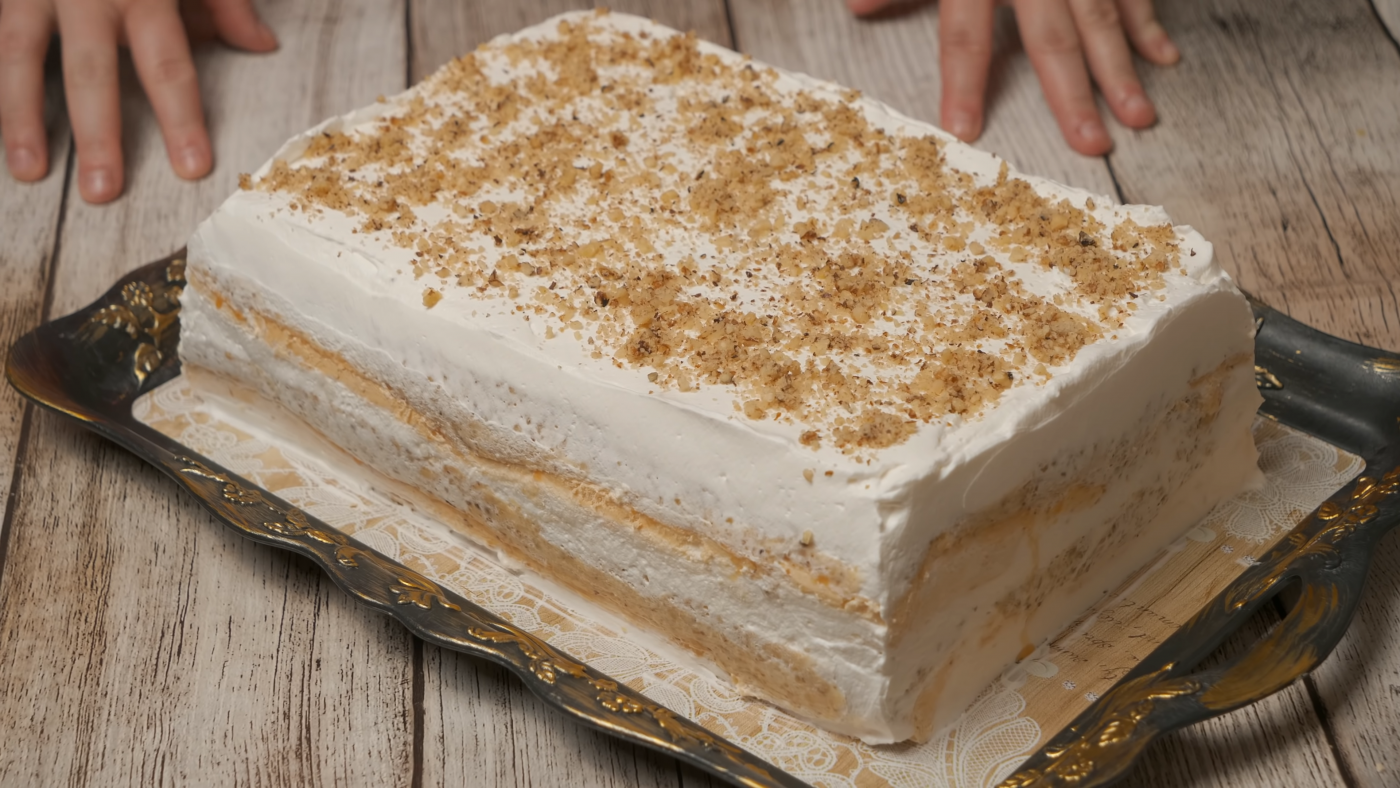 Na prvu koricu stavljate polovinu fila od oraha i polovinu slatke pavlake. Preko stavite drugu koru, a onda na nju ponovo isto uradite, s tim što ćete ovog puta umućenom slatkom pavlakom zagladiti tortu. Ostavite da se stege u frižideru nekoliko sati.