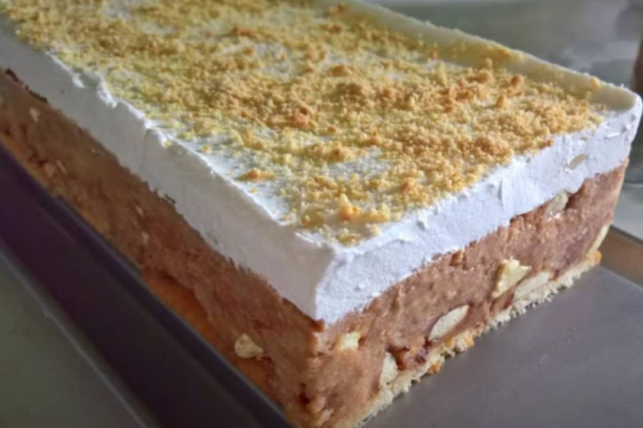 Slatku pavlaku dobro umutite sa šećerom u prahu, pa dodajte kiselu pavlaku i još malo mutite. Potom dodajte 150 grama mlevenog keksa, neki koji nije puno sladak i seckane bananice.