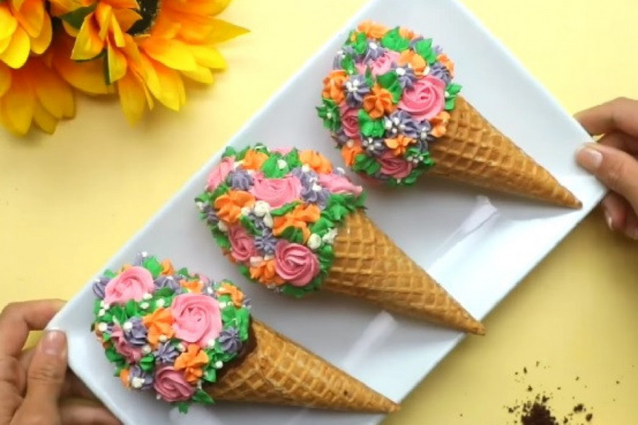 Kupite kornete za sladoled pa ih napunite kakao ili lešnik namazom. Zapušite kornet čokoladnim mafinom, namažite na njega malo kakao krema pa preki mafina stavite čokoladnu kuglicu. Srpemite šlag u zelenoj i nekoliko različitih boja za cvetove, kesu za šlag i nastavak sa najmanjim otvorom. Prvo našarajte čokoladnu kuglicom zelenom bojom za listove a onda napravite zavijutke različitih boja koje će predstavljati cvetove. Na poneke cvetove dodajte tačkice belog šlaga. Ovi jestivi cvetno-čokoladni buketi će biti pravi hit na rođendanu svake devojčice.