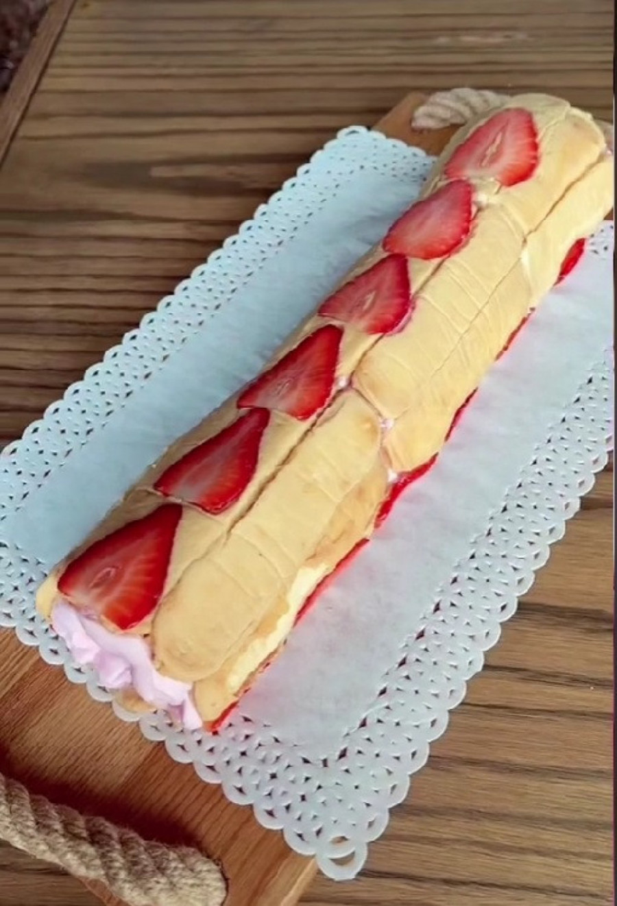 Kada je šlag umućen, sklonite pek papir sa piškota i šlagom nafilujte koru, pa izravnajte to punjenje. Nemojte razmazivati šlag skroz do ivica, kako on ne bi iscureo dok uvijate rolat ili ga sečete. Nakon toga, 200 g očišćenih celih jagoda poređajte negde po trećini rolata i uz pomoć donjeg pek papira uvijte svoj rolat.