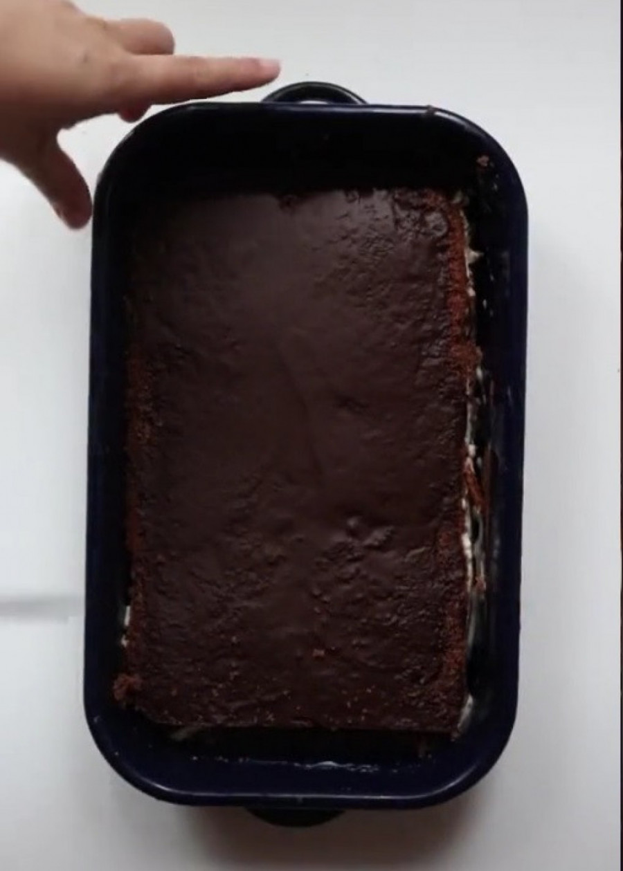 Ispečenu koru izvadite iz rerne i ostavite da se prohladi. Nakon toga je odvojite od papira za pečenje i isecite na dva sloja po sredini. Nastavite sa pripremom fila za ovaj kolač.