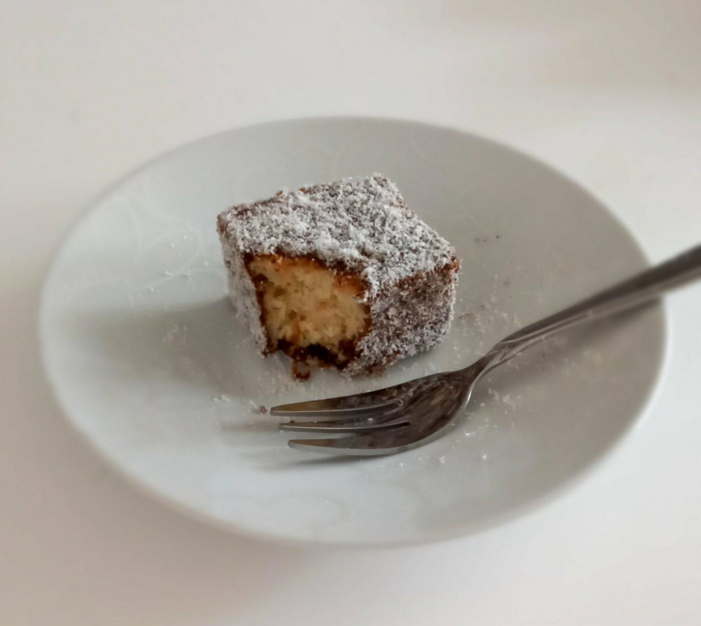 Na drugoj strani, u maloj šerpici rastopiti sastojke za preliv - margarin i čokoladu. Ispečen i ohlađen kolač, izrezati na kocke, a zatim umakati u preliv i uvaljati u kokos.
