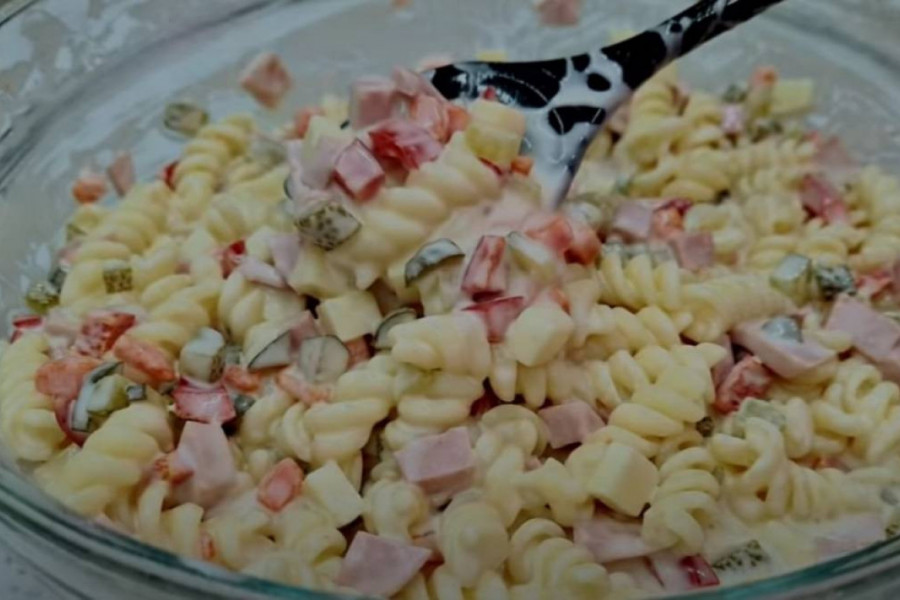 Šunku, jaja i majonez dodajte u testeninu i dobro promešajte. Posolite i pobiberite po ukusu.