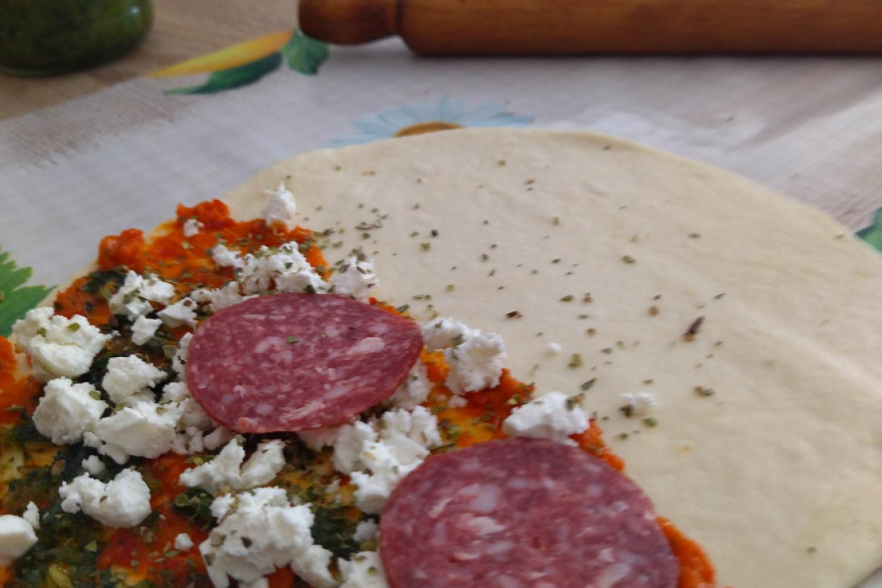 U posudu usuti brašno, dodati kvasac, ulje i so i umesiti ga sa mlekom i vodom. Dodavati povremeno, u zavisnosti od potrebe još malo mleka da se testo lepo umesi. Kada je testo formirano u jednu veću kuglu, pokriti ga krpom ili poklopcem i ostaviti da naraste oko pola sata. Naraslo testo podelimo na stolu na četiri jednaka dela, odnosno razmesimo u četiti kugle. Ostaviti ih pet minuta a zatim razvući jednu po jednu u krug prečnika oko 25cm. Na svakoj razvučenoj podlozi od testa, na jednoj polovini redom dodavati i premazati: ajvar, pesto sos, sir i zatim poređati iseckani kulen ili salamu(nekoliko parčića). kada ste to uradili preklopite pancerotu, viljuškom povežete po ivici krajeve. Zatim premažete svaku pancerotu prethodno umućenim jajetom. Preko pospete susam, origano ili kim u zavisnosti od toga šta volite. Stavite u rernu da se peče na 250'. Prijatno!