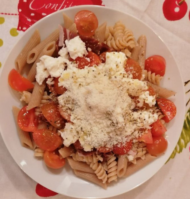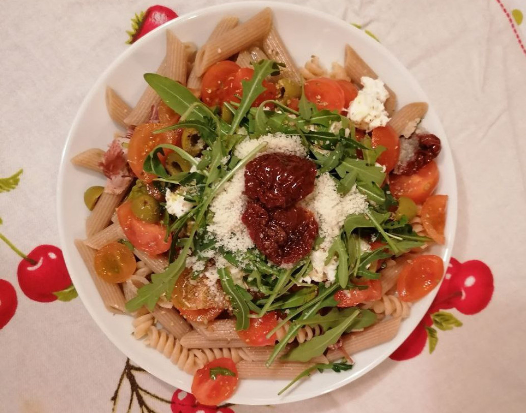 Ova obrok salata je jako praktična jer se može modifikovati po svačijem ukusu. Rukola i masline se mogu izbaciti, ako ih ne volite, začine možete dodavati po želji, možete čak dodati i komadiće čili papričice, ukoliko volite pikantnije zalogaje. Naravno, za vegetarijansku opciju samo izbacite pršutu ili pančetu. Recept se može praviti i sa običnom pastom. Međutim, uz integralnu testeninu sveži ukusi bolje dođu do izražaja.