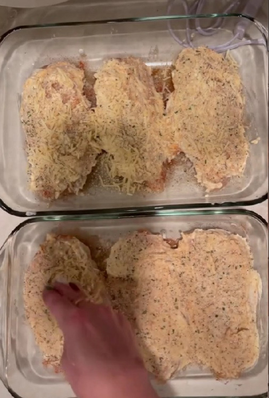 Poređajte filete pilećeg belog mesa u vatrostalnu činiju i utapkajte ih papirnim ubrusom kako bi pokupio višak vlage. U činiju sipajte majonez i u njega dodajte par šaka grublje rendanog parmezana, pa sve to sjedinite.