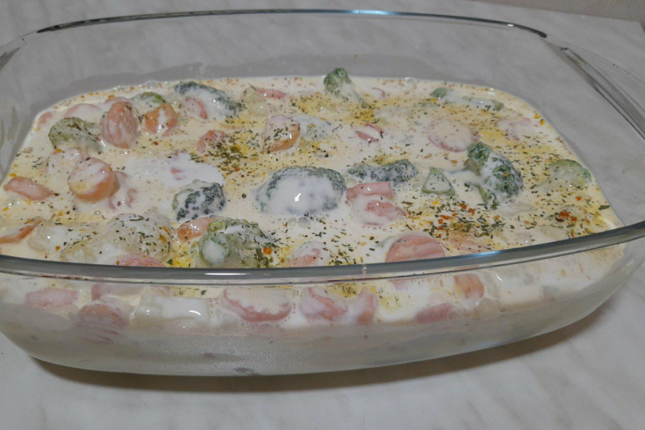 Pileltinu isecite na kockice i stavite da se prži na zagrejanom ulju. Začinite sa suvim biljnim začinom i biberom. U nauljani pleh prvo poređajte meso. U drugoj posudi spojite mešavinu povrća sa pavlakom za kuvanje. Smesu prelijte preko mesa, a zatim pospite malo parmezana. Ubacite u rernu da se peče na 200 stepeni oko 30 minuta. Desetak minuta pre kraj pečenja izvadite pleh pospite malo parmezana pa ga vratite na pečenje na 5 minuta, da se sir rastopi.