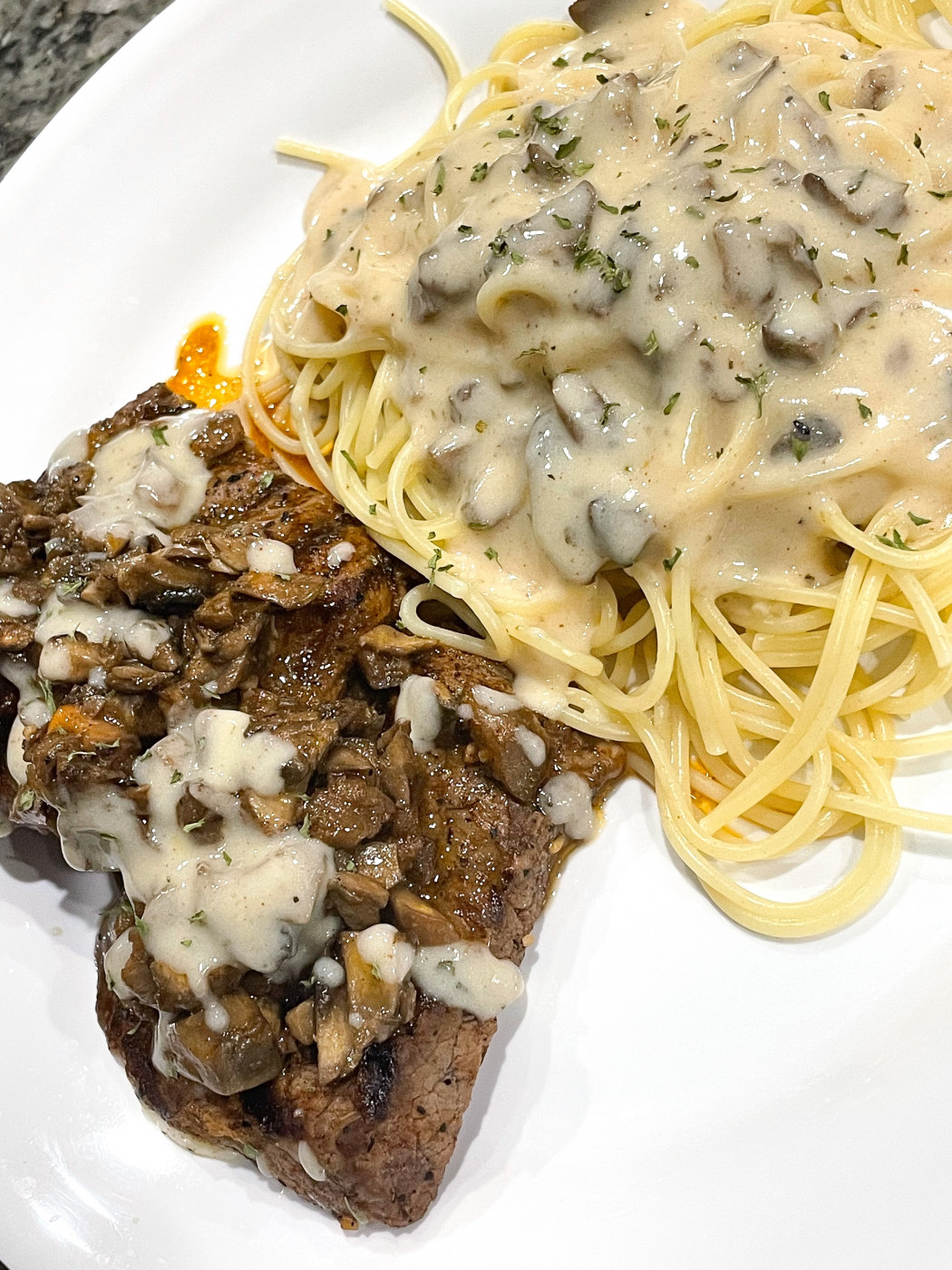 Šnicle vratite u šerpu preko pripremljenih pečuraka. Dodajte lovorov list i, ukoliko koristite, nalijte belim vinom. Ostavite nekoliko minuta da vino ispari i otpusti aromu, a zatim dodajte supu ili vodu u količini dovoljnoj da prekrije meso. Posudu poklopite i ostavite da se jelo lagano dinsta na tihoj vatri između 45 i 60 minuta. Tokom tog vremena meso će postati izuzetno mekano, a ukusi će se sjediniti.