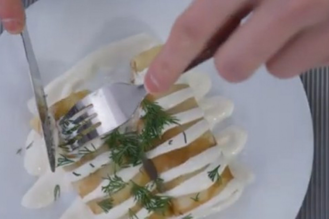Izmrvljenu gorgonzolu pomešajte sa prethodno iseckanim ćurećim prsima na kockice. Krem sir potom dodajte u gotovu smesu, nafilujte palačinke i urolajte ih. Jaja u međuvremenu umutite sa pavlakom, dodajte u njih so, biber i iseckani peršun, pa prelijte njima palačinke.