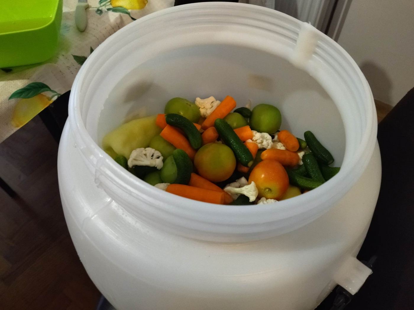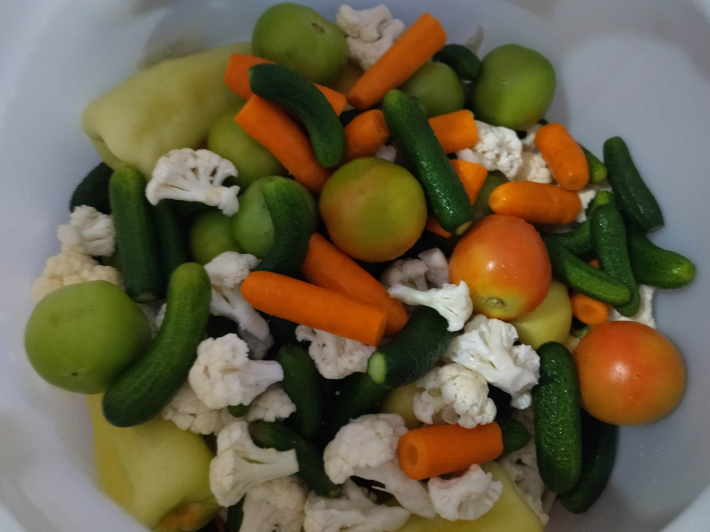 U jednu veliku šerpu sipati vodu, a zatim sirće i dodati so, šećer i konzervans i vinobran. Dobro promešati. Nema kuvanja. U tegle ili bure poređati povrće - paprike, karfiol i sve navedeno i dolivati tom tečnošću dok se ne pokrije vrh. Staviti plastiku koja služi da bi fiksirala povrće. Ako su u pitanju tegle, prekriti ih providnim celofanom i poklopiti poklopcem. Staviti na predviđeno hladno mesto.