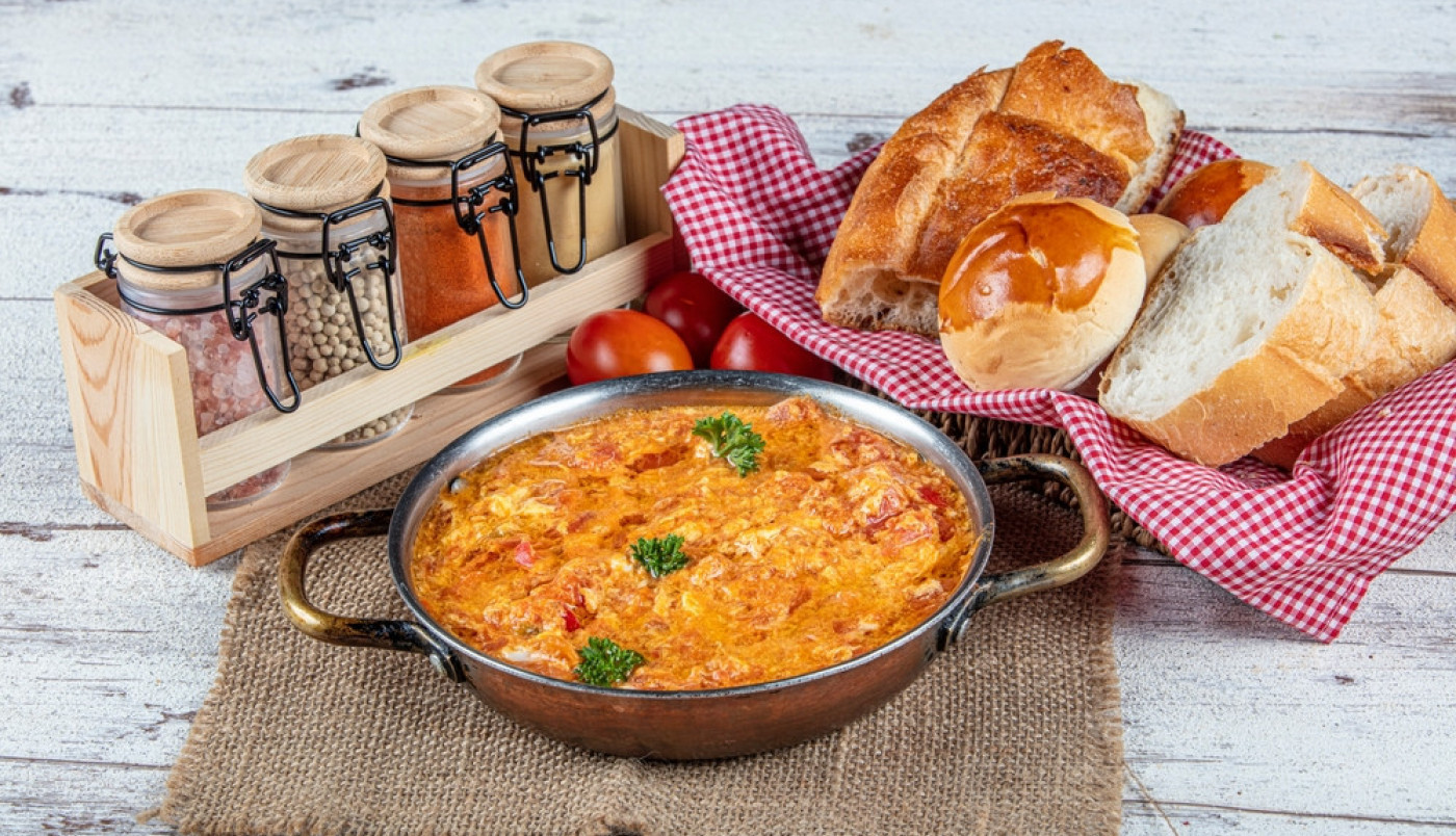 Povrće oprati i iseckati. Poželjno je da paradajz ogulite pre seckanja (oštrim nožem zaseći sa donje strane, pa odatle početi ljušćenje). U većoj šerpi ili dubokom tiganju ugrejati 150 ml maslinovog ulja, pa spustiti papriku i luk, uz dodatak dve ravne kašičice soli da se prže na jačoj vatri. Povremeno promešajte, a ako počne da se lepi smanjiti temperaturu prženja i mešati češće. Kad spadne na polovinu početne zapremine dodati paradajz i krčkati na srednje-jačoj vatri dok skoro sva tečnosti ne uvri. Ukupno vreme prženja je od 45 minuta do 60 minuta zavisno od jačine vatre i širine posude. Servirati toplo, uz jaje na oko i hleb po izboru.