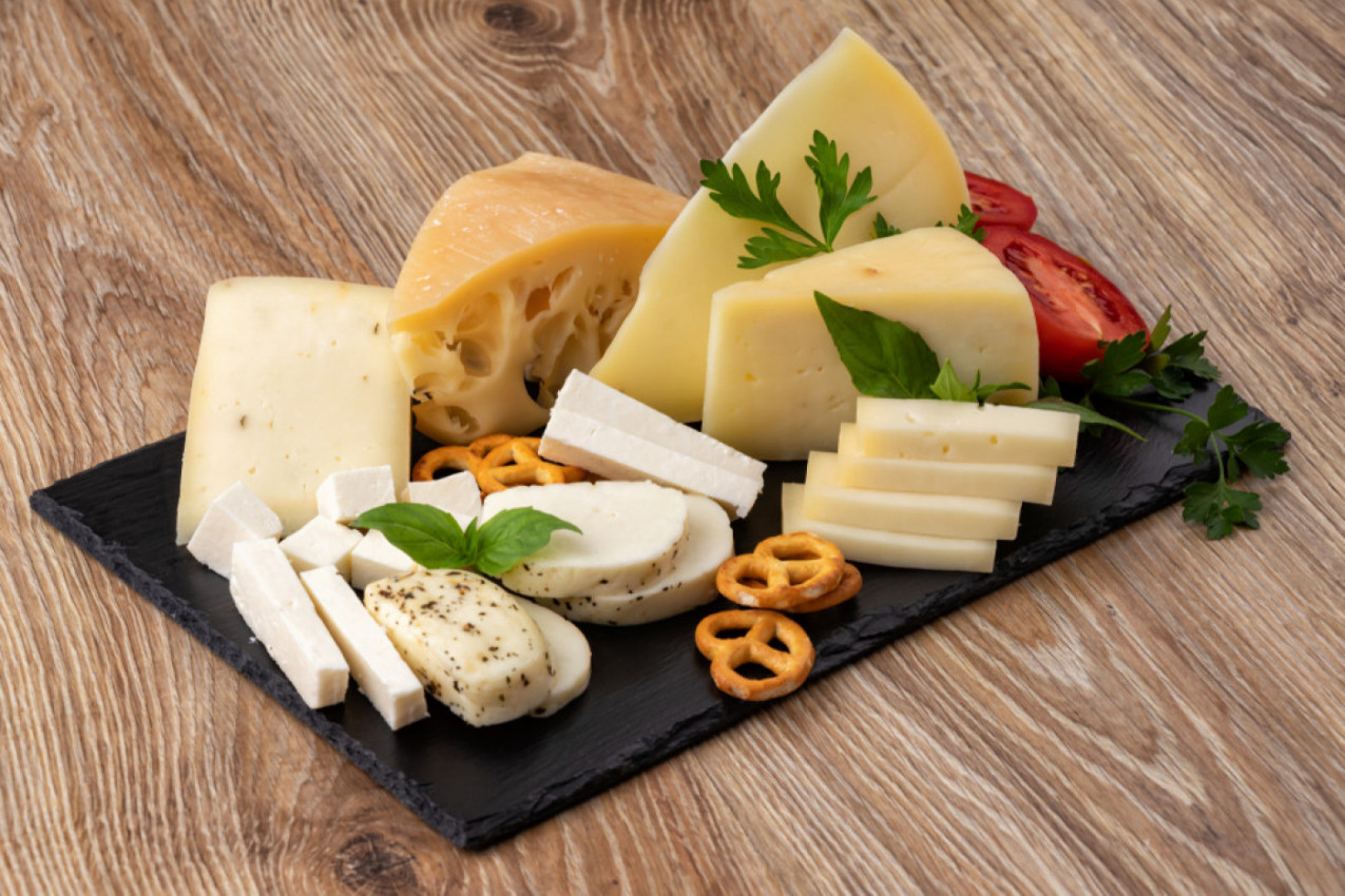 Najpre pripremite sve sastojke: jaja, krem sir, rendanu gaudu, belo brašno, kukuruzno brašno, kukuruzni griz, prašak za pecivo, ulje, mleko, mineralnu vodu i blanširanu blitvu.