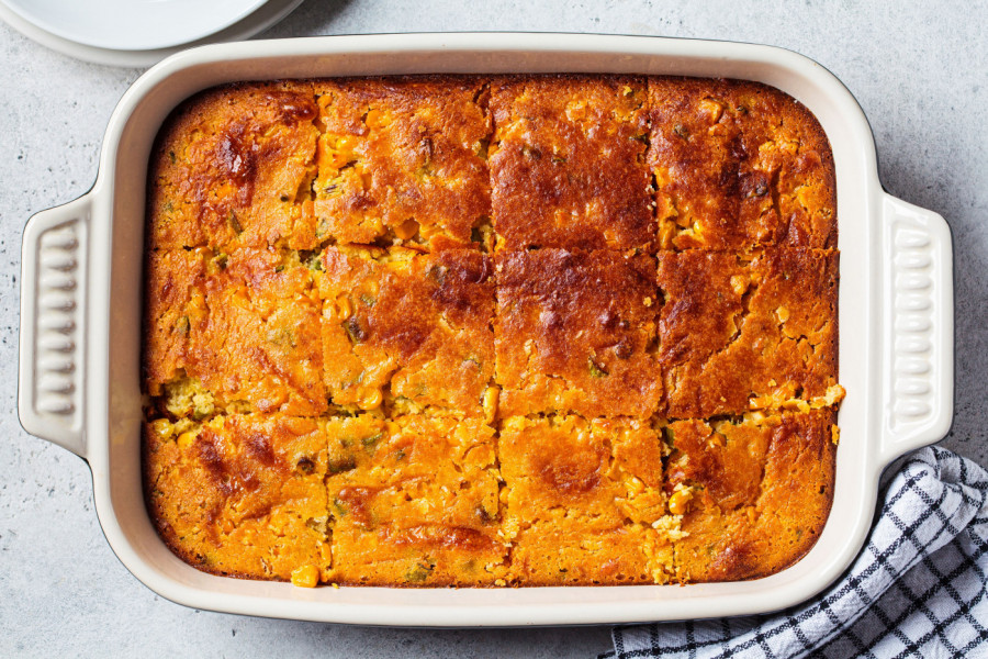 Sve izlijte u pleh podmazan ili obložen papirom za pečenje i pecite u rerni zagrejanoj na 200 stepeni oko 40-45 minuta. Kada proja dobije zlatno smeđu boju, izvadite je, ostavite da se kratko prohladi, pa isecite na kocke i poslužite.