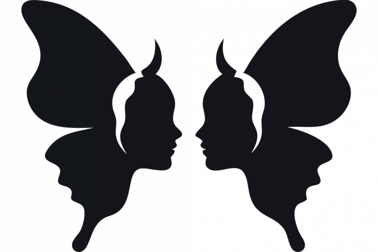 Ilustracija prikazuje dve simetrične crne figure koje se mogu interpretirati kao leptir, dva lica koja se gledaju ili pak stilizovane siluete sa strane. Svaka percepcija ima svoje značenje.