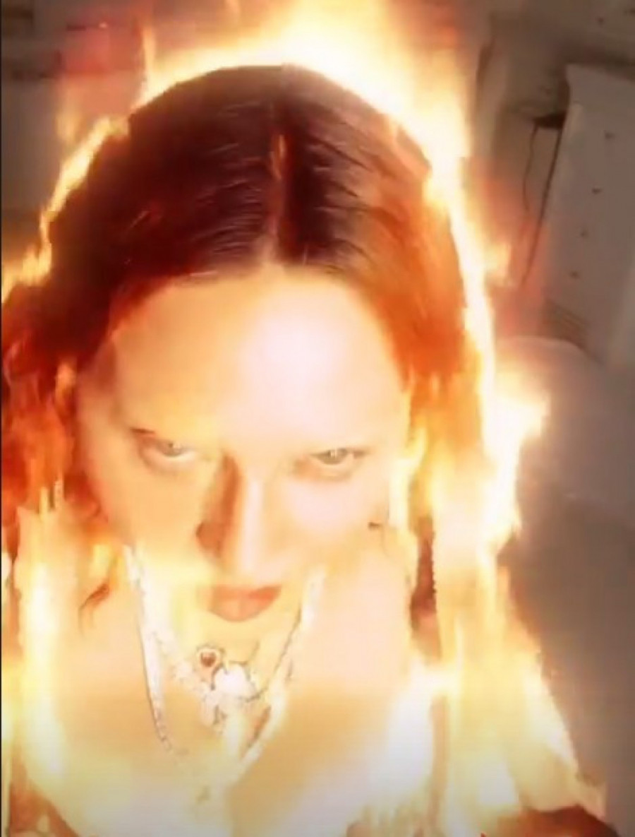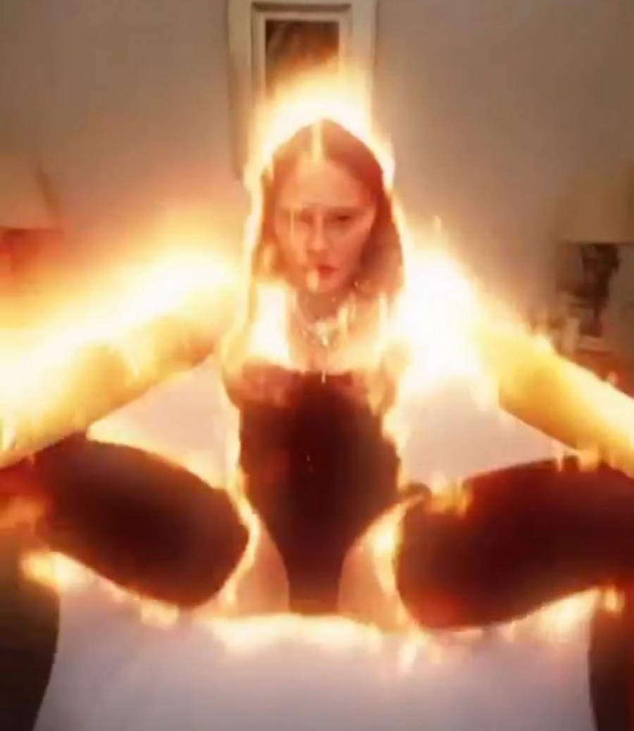Madona je ponovo u seriji objava na Instagramu prikazala snimke na kojima pozira u crnom čipkanom bodiju, samodržećim čarapa i čizmicama. Ona je dodatno začinila snimke filterima na kojima izgleda kao da je u plamenu i da iz nje izbija vatra. Ona tako stoji ili leži na krevetu sa nogama u vazduhu, prekšta ili širi noge, čak pokazuje i zadnjicu. U opisu snimaka stoji: “Demo….ona gori”, a to je preneo i Miror.