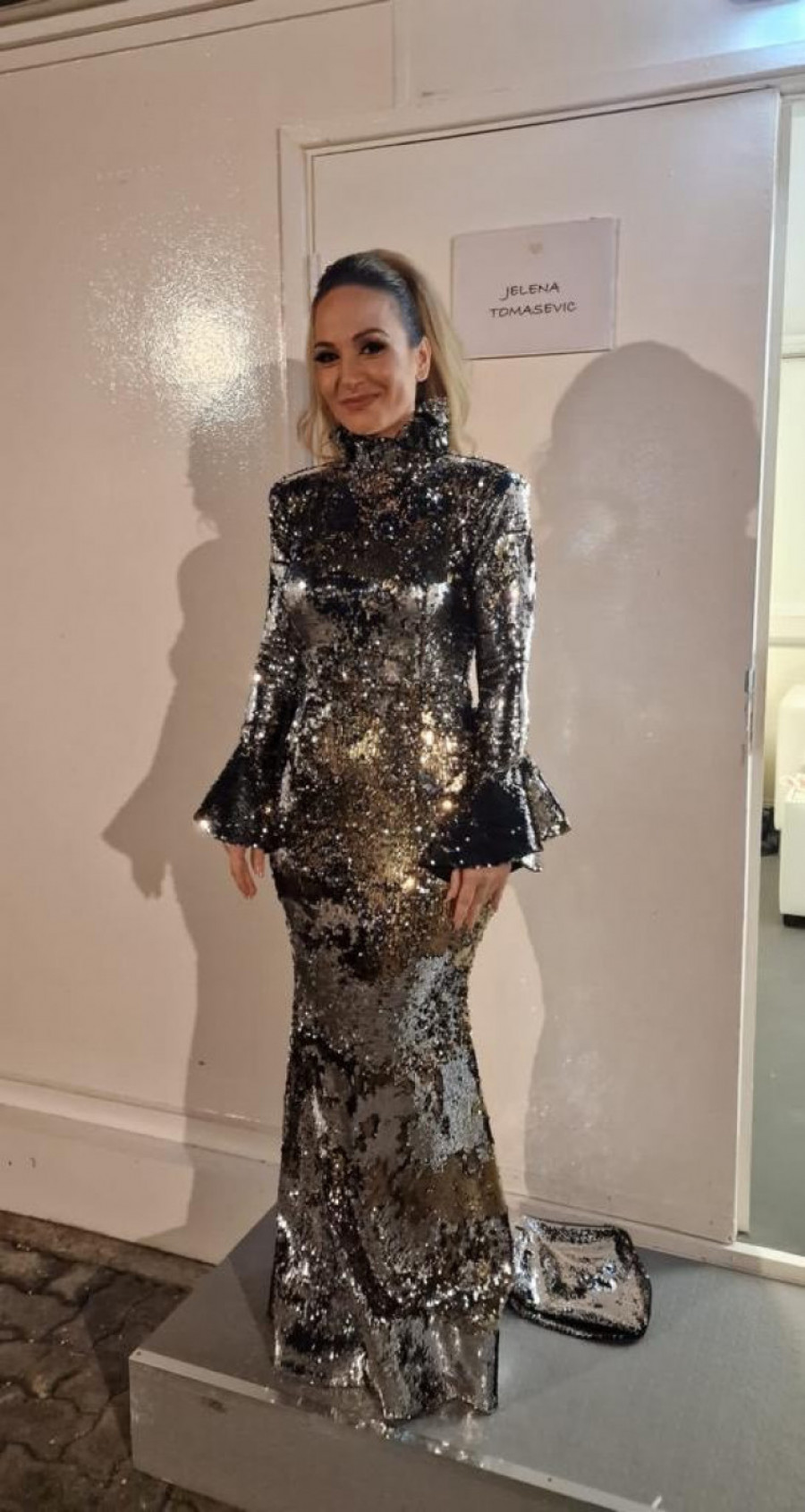 Iako svedeno obučena, haljina koju je odabrala za ovaj nastup mnoge je ostavila bez daha. Pripijena uz telo naglasila je Jelenine obline na kojima bi joj pozavidela i Dženifer Lopez. Sedefasta haljina, koja je hit ove sezone, pevačici je pristajala kao salivena.