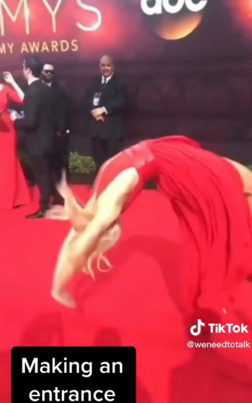 Tepihom je, naime, prošetala zgodna plavuša u crvenoj haljini koja je prisutne počastila svojim akrobacijma izvevši zahtevan salto i to u dugačkoj haljini i na visokim potpeticama. Dok su prisutni pokušavali da dođu sebi od šoka i iznenađenja, mlada dama je već bila na nogama.