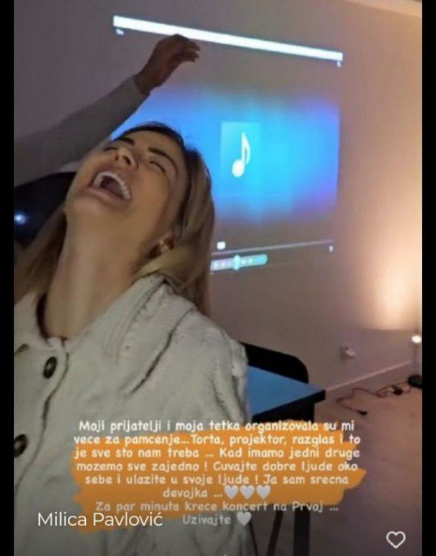 - Moji prijatelji i moja tetka organizovali su mi veče za pamćenje... Torta, projektor, razglas i to je sve što nam treba... Kad imamo jedni druge možemo sve zajedno! Hvala ti Bože na svemu ikada... I na ovim divnim ljudima koje si doneo u moj život! Čuvajte dobre ljude oko sebe i ulažite u svoje ljude! Ja sam srećna devojka! - napisala je Milica uz pregršt smajlija.
