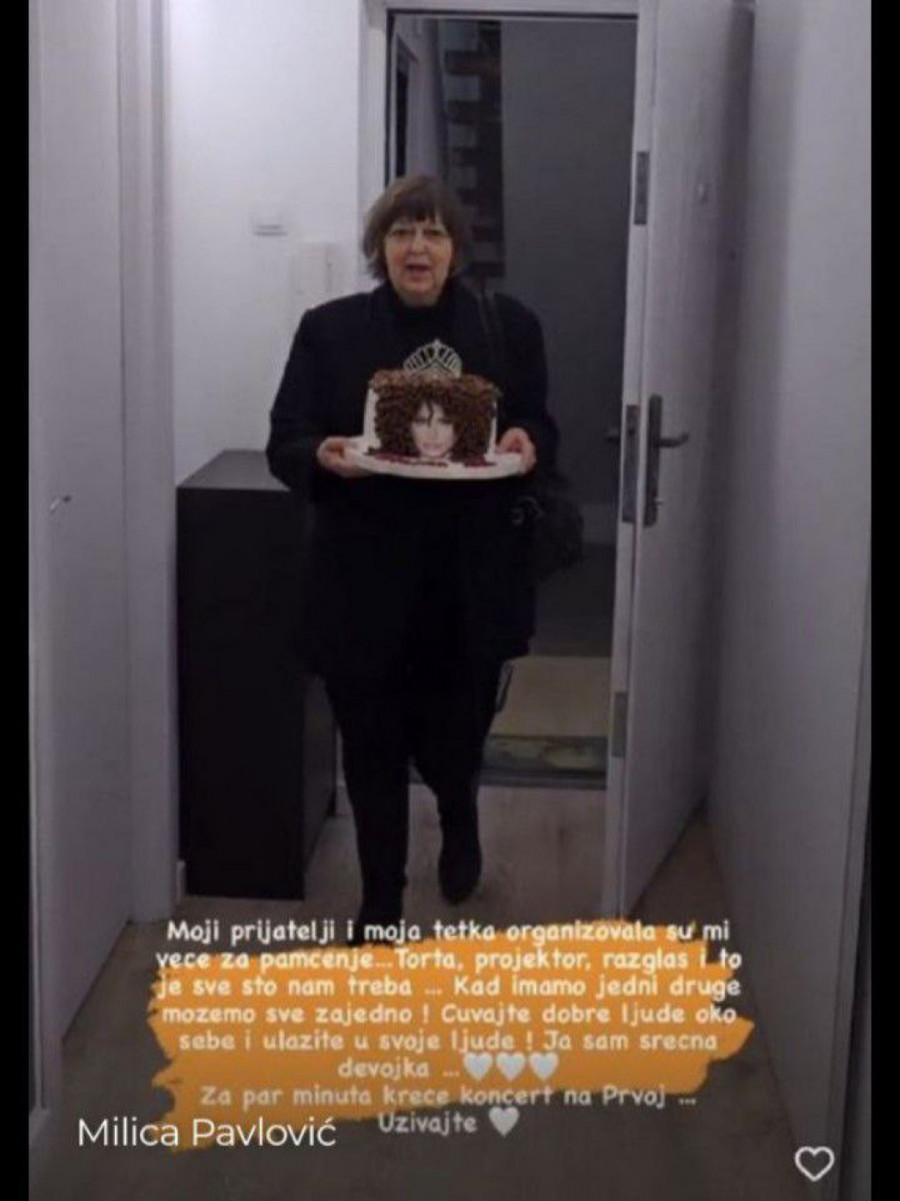 Pevačica je otvorila tortu koja je na vrhu imala krunu, a unutra je, čini se, bila i muzička kutija, iz koje se čula njena pesma. Pavlovićeva nije krila oduševljenje, smejala se od srca i ponavljala "Umreću!", nakon čega je tetki poletela u zagrljaj. Međutim, ono što je u startu "oprostila" toj voljenoj ženi jeste da je fotografiju kojom je ukrašena torta ona uzela iz davnih dana. Tako se tu našao Miličin lik od pre nekoliko godina, dok je vrhunac predstavljao šlag u vidu kose popularne pevačice, ali ne njene plave, duge i prave, već loknaste i braon boje. Milici je to bilo najinteresantnije, pa je utiske odmah prenela i u vidu priče na Instagramu.