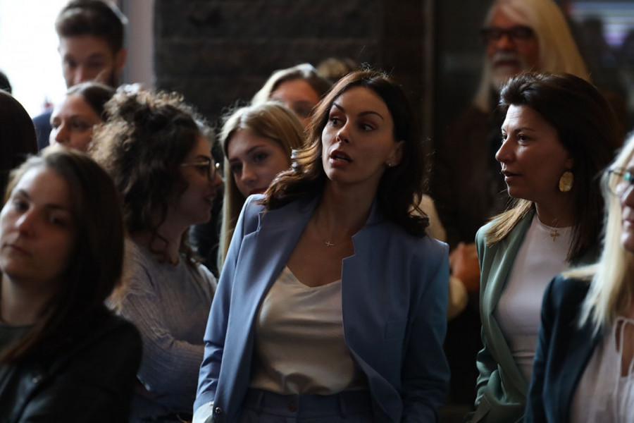 Njih dve su se odlučile za klasično odelo ravnog kroja, s tim što je Slobodino bilo malo tamnije plave nijanse, dok je Milenino bilo svetlije. Obe su ispod sakoa ponele bele komade, Milena majicu, a Sloboda bluzu na V izrez koja je otkrivala njen vrat i dekolte. Jedina razlika u stajlingu dve lepe glumice je bila u odabiru obuće. Milena je imala salonke crne boje na visoku štiklu, dok se Sloboda odlučila za cipele u krem nijansi.