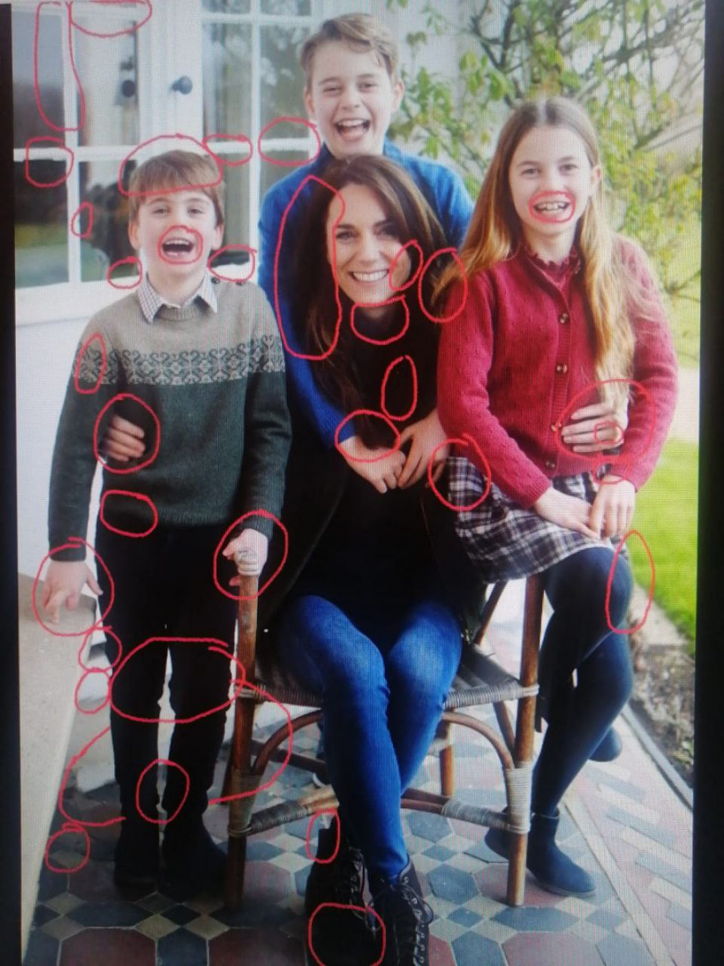 Na njoj princeza od Velsa nasmejana pozira sa svoje troje dece – prinčevima Džordžom i Luisom i princezom Šarlot. Mnogi bi rekli da su i princeza i mališani previše razdragani, s obzirom na situaciju kroz koju cela britanska kraljevska porodica prolazi u poslednje vreme. Ipak, to nije jedini razlog zbog kog su korisnici društvenih mreža posumnjali u njenu verodostojnost. Malo po malo, uspevali su da pronađu sijaset grešaka koje upućuju na to da je reč o veoma nevešto fotošopiranoj slici.