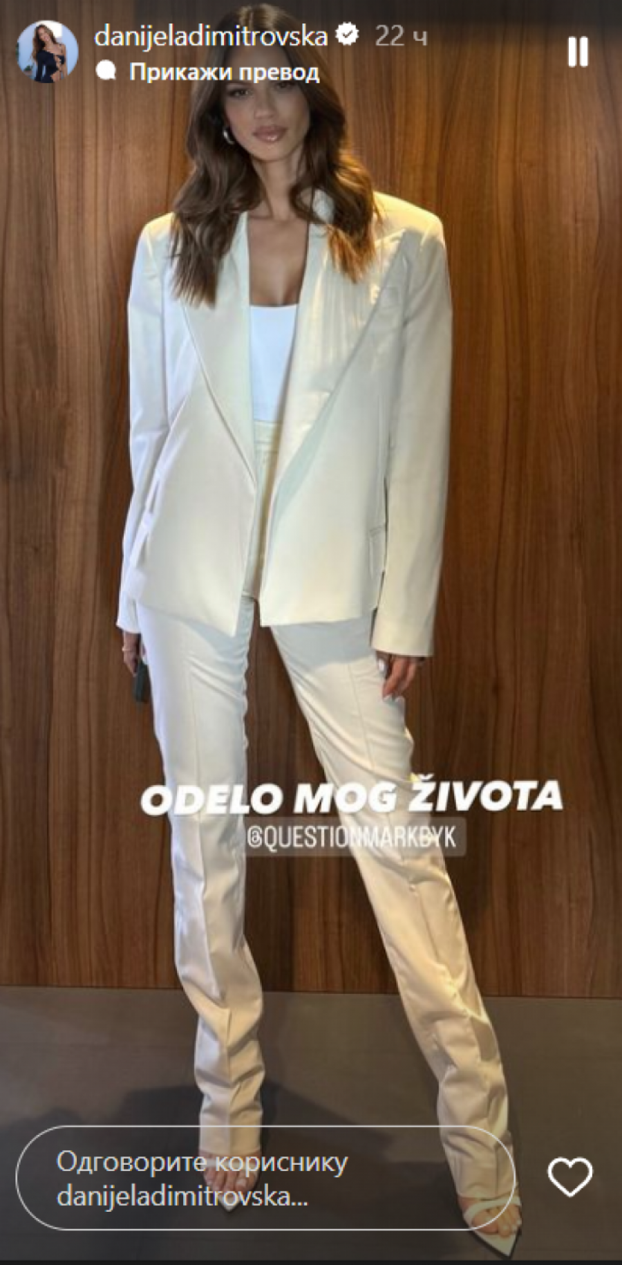 - Ovo odelo sam prvi put nosila u Beču i toliko sam se dobro osećala u njemu, da sam odlučila da ga ponovo obučem i za intervju koji sam nedavno imala u Zagrebu. Sva u belom - napisla je Dimitrovska na jednoj od svojih priča na Instagramu koju je podelila sa fanovima. Naravno, na intervjuu je ispod sakoa ponela belu majicu.