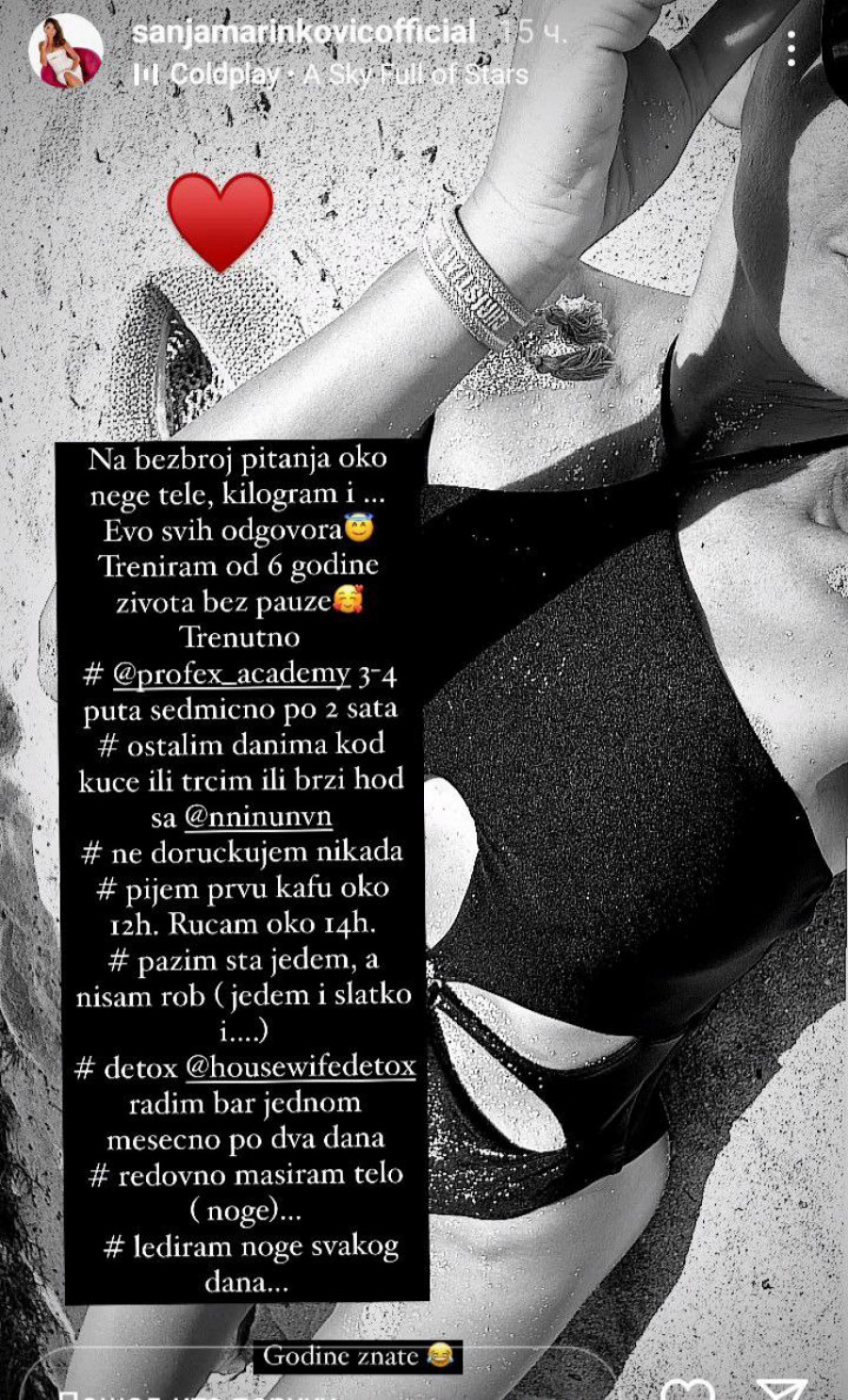 - Na bezbroj pitanja oko nege tela i kilogramima, evo svih odgovora. Treniram od šeste godine života bez pauze, trenutno tri-četiri puta sedmično po dva sata. Ostalim danima kod kuće ili trčanje i brzi hod. Ne doručkujem nikada. Prvu kafu pijem oko 12h. Ručam oko 14h, pazim šta jedem, ali nisam rob, jedem i slatko. Detoks radim bar jednom mesečno po dva dana. Redovno masiram telo, noge. Lediram noge svakog dana. Godine znate - napisala je ona na priči na svom Instagram nalogu.