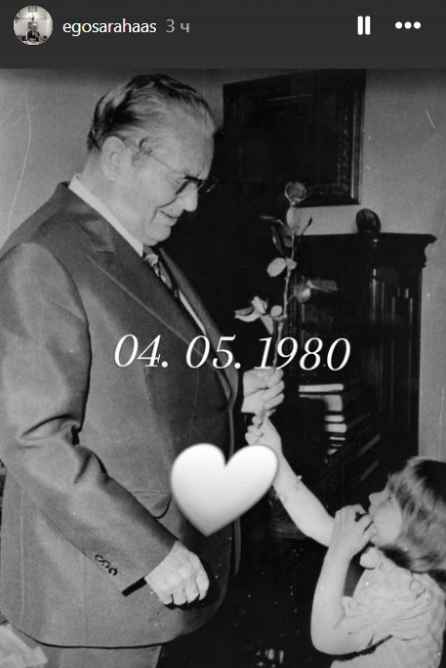 Praunuka Josipa Broza Tita, Sara Haas (30), ćerka rediteljke Saše Broz, danas je na svom Instagram nalogu sve podsetila na trenutak kada je umro Tito. Ona je na stori na svom Instagramu postavila fotografiju devojčice koja Titu predaje ružu.