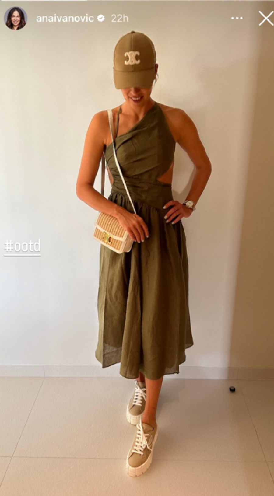 Ivanovićeva se pojavila u savršenoj maslinastozelenoj letnjoj sportskoj kombinaciji. Ponela je lanenu haljinu koja je išla preko jednog ramena otkrivajući drugo golo, a više nego očigledno je bilo da nekadašnja teniserka ispod nje ne nosi brushalter. Haljina se tankom bretelom vezivala oko vrata, dok je najverovatnije imala otvorena leđa, budući da je i veći deo struka bio go.