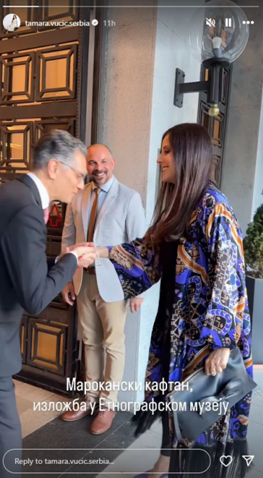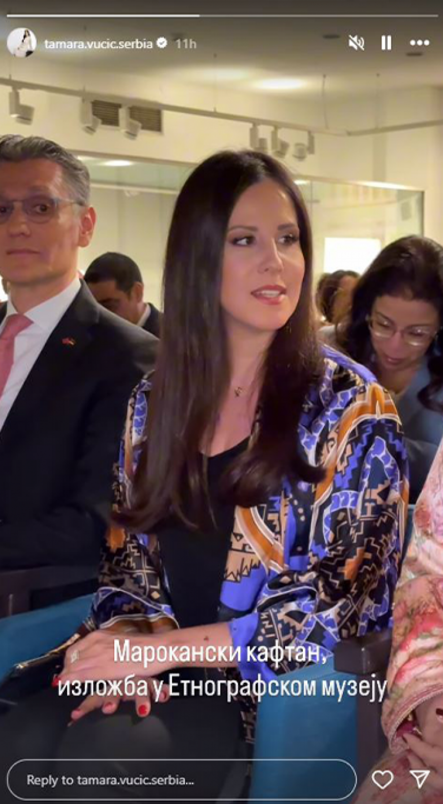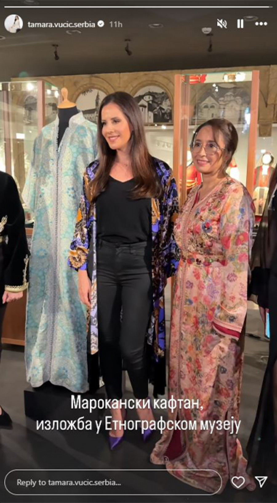 Ova izložba, poklon ambasade Kraljevine Maroka Etnografskom muzeju, slavi bogatstvo i lepotu marokanske mode kroz vekove. Međutim, jednako impresivan, kao i eksponati izložbe, bio je i stil Tamare Vučić, koji je plenio pažnju prisutnih. Na svom Instagram profilu objavila je stori na kom smo imali priliku da vidimo kako se obukla za ovu priliku.