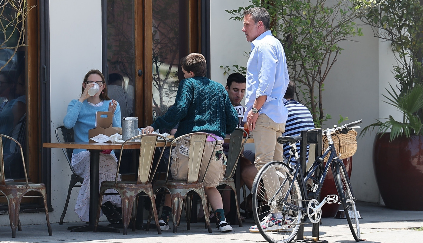 U jednom trenutku, Aflek se čak i retko osmehnuo, dok je Vajolet stavila ruku oko njegovog vrata i ćaskala s njim dok je hodala. Njegova deca i dvoje njihovih prijatelja sedeli su ispred restorana i svi su viđeni kako ćaskaju i jedu. Glumac je ležerno izgledao imao je majicu uparenu sa raskopčanom kariranom košuljom dugih rukava, farmerke i sive patike.