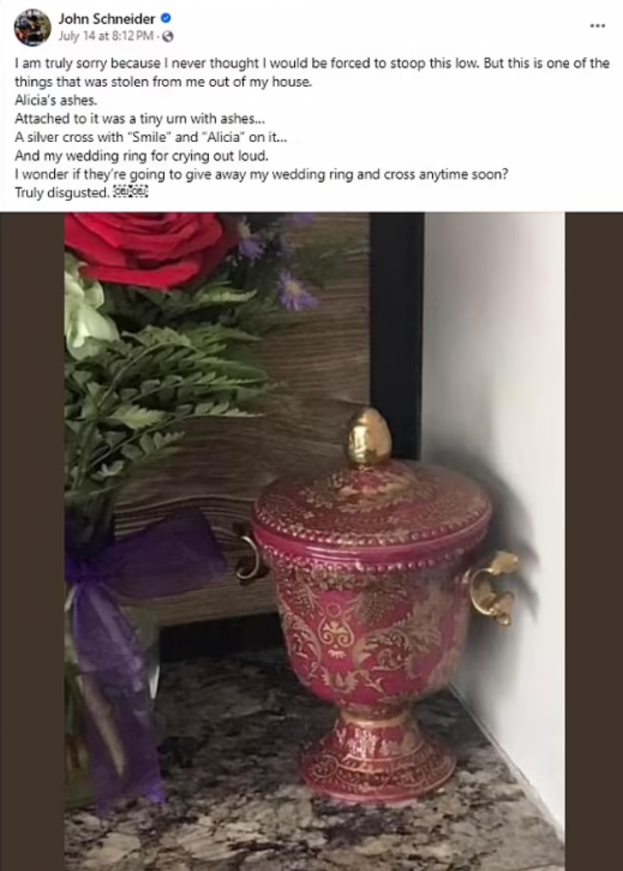 - Ovo je jedna od stvari koja mi je ukradena iz kuće. Ališin pepeo. Prikačena uz nju bila je mala urna sa pepelom... Srebrni krst sa natpisom Ališa. Zaista mi je žao jer nikada nisam mislio da ću biti primoran da se spustim tako nisko. I moj venčani prsten, zaboga. Pitam se da li će uskoro vratiti moj venčani prsten i krst? Zaista sam zgrožen - napisao je zapanjeni glumac, a o tome je pisao i Daily Mail.