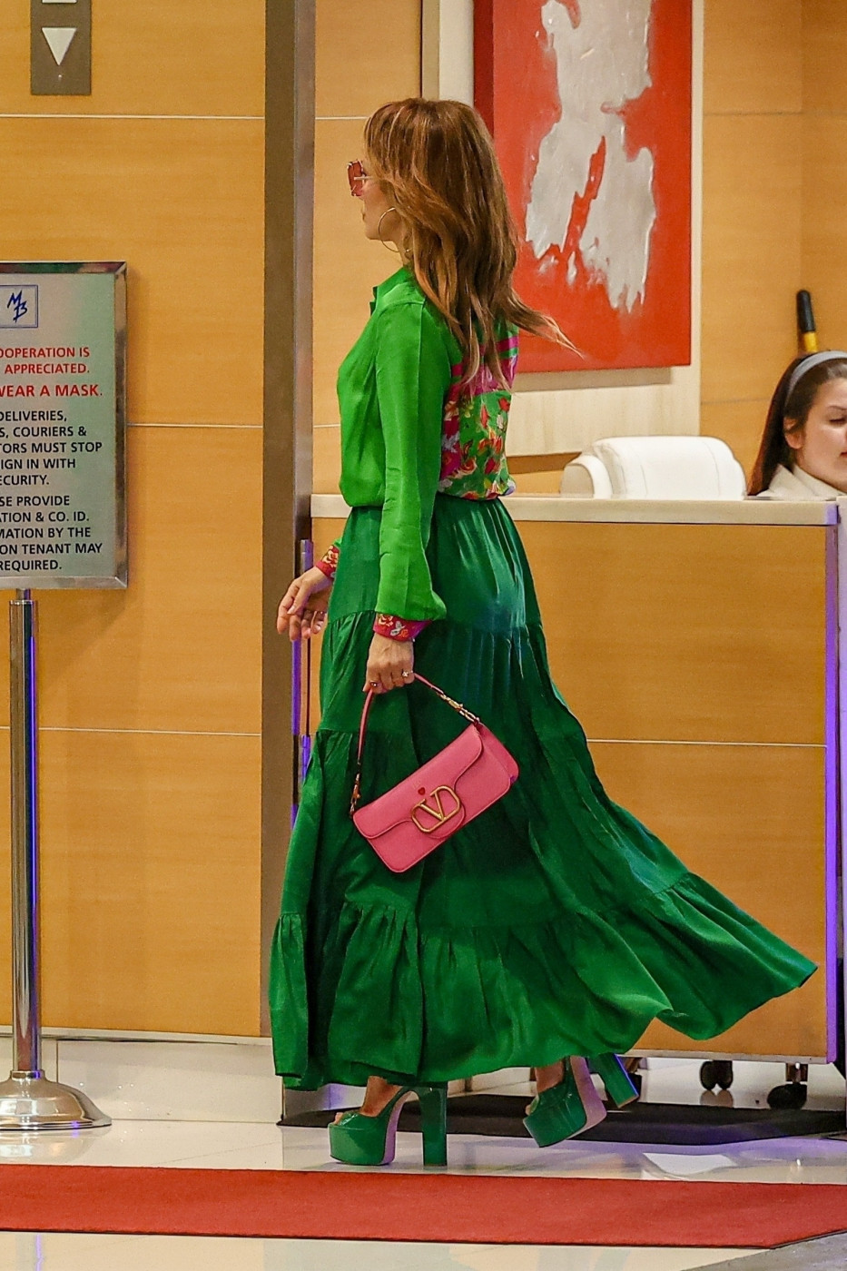 Lopez, koja se trenutno priprema za "novi imidž", izgledala je zapanjujuće u jarko zelenom topu i odgovarajućoj suknji. Pevačica je upotpunila svoj izgled visokim zelenim štiklama s platformom i žutom Valentino torbicom. Za dodatnu zaštitu od sunca, nosila je velike sunčane naočare i zlatne obruče.