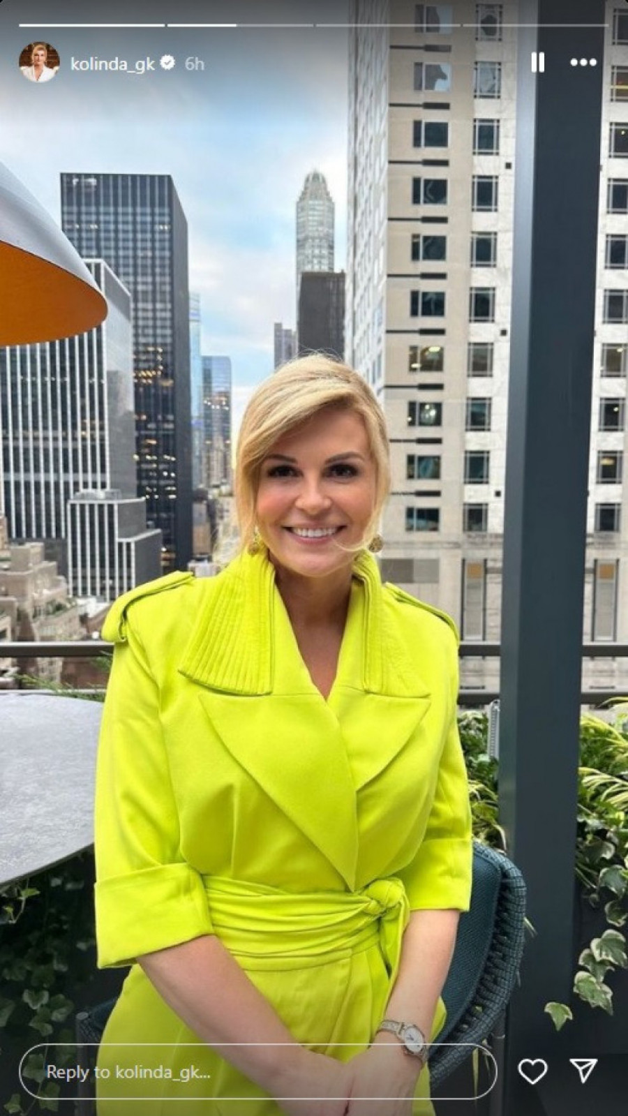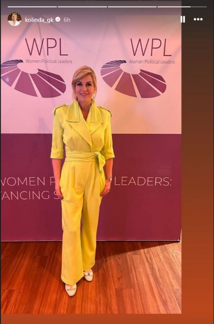 Kolinda je odabrala jarko žuti kombinezon poznatog hrvatskog brenda, a kaišem je istakla tanani struk koji nije imala verovatno od svojih dvadesetih godina.