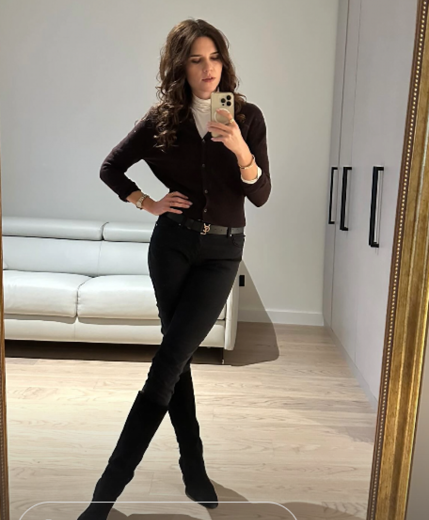 Opredelila se za crne uske pantalone, koje je uparila sa kratkim tamnobraon džemperom na kopčanje ispod kog je ponela belu rolku. Akcenat je bio i na kaišu brenda YSL, koji je mnogima prvo "zapao za oko", dok je ceo stajling zaokružila dugim antilop čizmama s visokim potpeticama. Šminku nije nosila, a duga kosa padala joj je u talasima preko ramena, a u prvom planu bila je i njena manekenska građa.