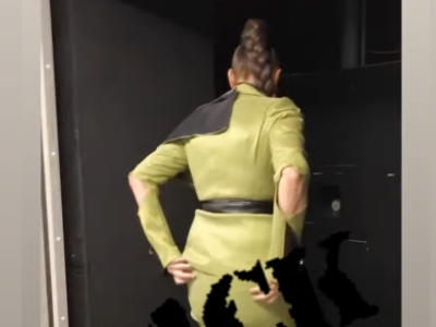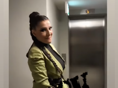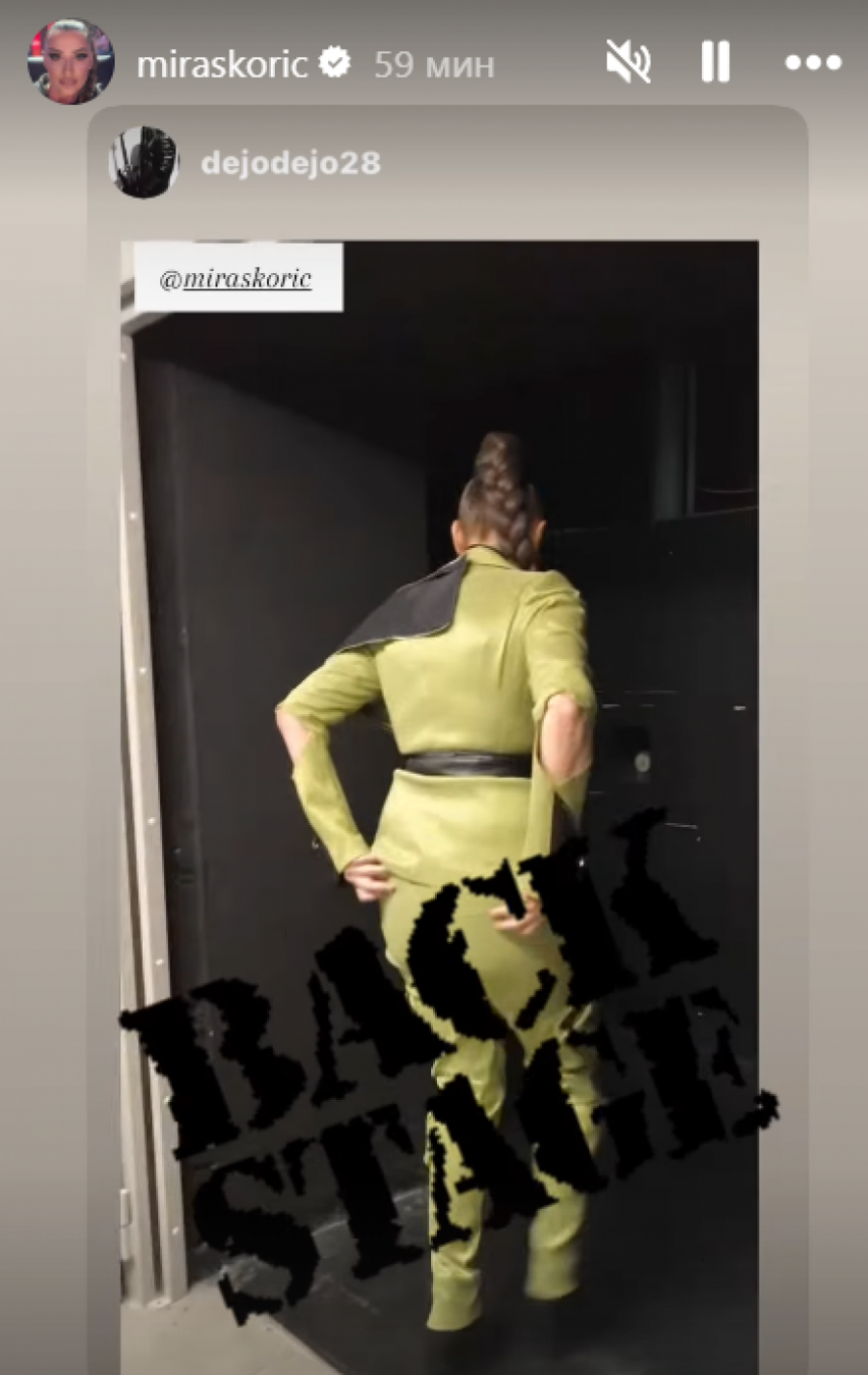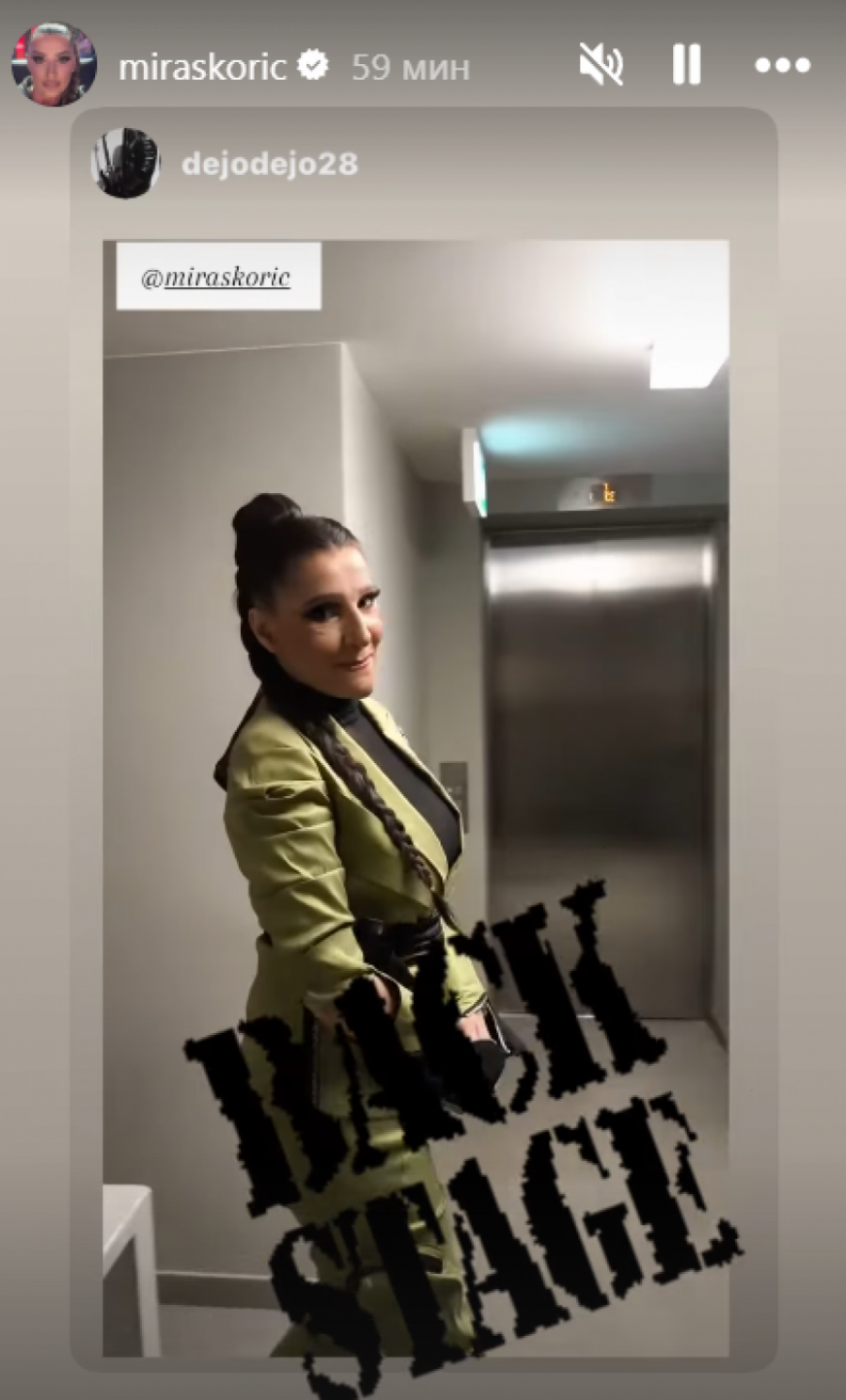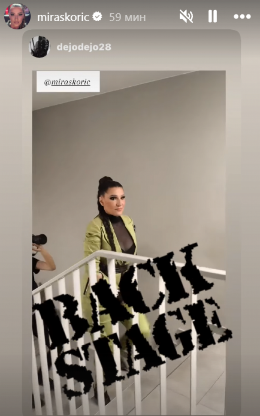 Mira je ispod sakoa ponela providnu rolku od crnog tila ispod koje se jasno video crni grudnjak. U donjem delu su usledile ništa manje atraktivne pantalone identične boje, sa dodatim šlicevima i drugim dodacima. Mira je kosu podigla, a usledila je duga pletenica koja joj je padala sa jedne strane ramena.