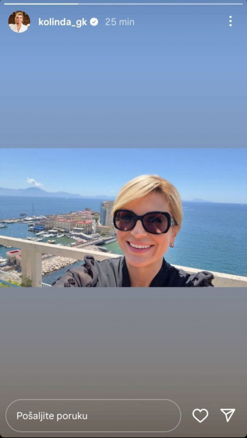 Bivša predsednica Hrvatske Kolinda Grabar Kitarović trenutno boravi u Napulju, a delić atmosfere sa svog putovanja podelila je sa pratiocima na Instagramu. Nju na pomenutoj društvenoj mreži prati više od 300.000 ljudi, gde prate sve njene aktivnosti koje želi javno da podeli. Na fotografiji objavljenoj na Instagram storiju vidi se kako uživa na predivnom vidikovcu s pogledom na istorijski dvorac Castel dell’Ovo - jedno od najpoznatijih mesta italijanske obale.
