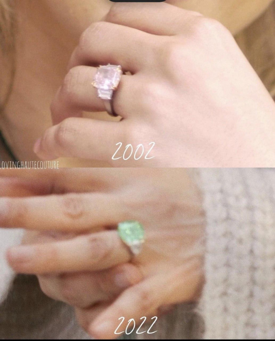Poznati dvojac se prvi put verio pre skoro 20 godina, novembra 2002, prilikom čega je poznati holivudski glumac svojoj izabranici poklonio prsten maltene identične veličine i oblika kamena za kakav se odlučio i sada 2022. Tada je u pitanju bio dijamant klasične boje, roze zlata od 6,1 karata, čija se vrednost procenjivala na između 1,2 do 2,5 miliona dolara.