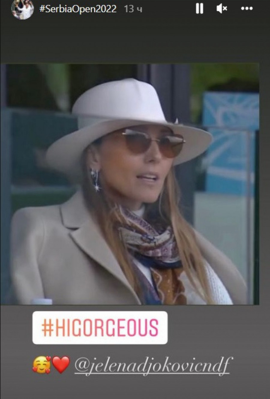 Misteriozna dama sa veliki naočarima, zagrnuta ešarpom i u velikom belom šeširu, sedi u loži i pažljivo promatra dešavanja na terenu. Ona gleda u igrače, a svi ostali gledaju baš u nju i pitaju se ko je ta žena. Sve dok ne izoštre pogled i ne shvate da se radi o supruzi Novaka Đokovića, Jeleni, koja se na Serbia Openu pojavila u izdanju koje je sve prijatno iznenadilo, pa i očaralo.